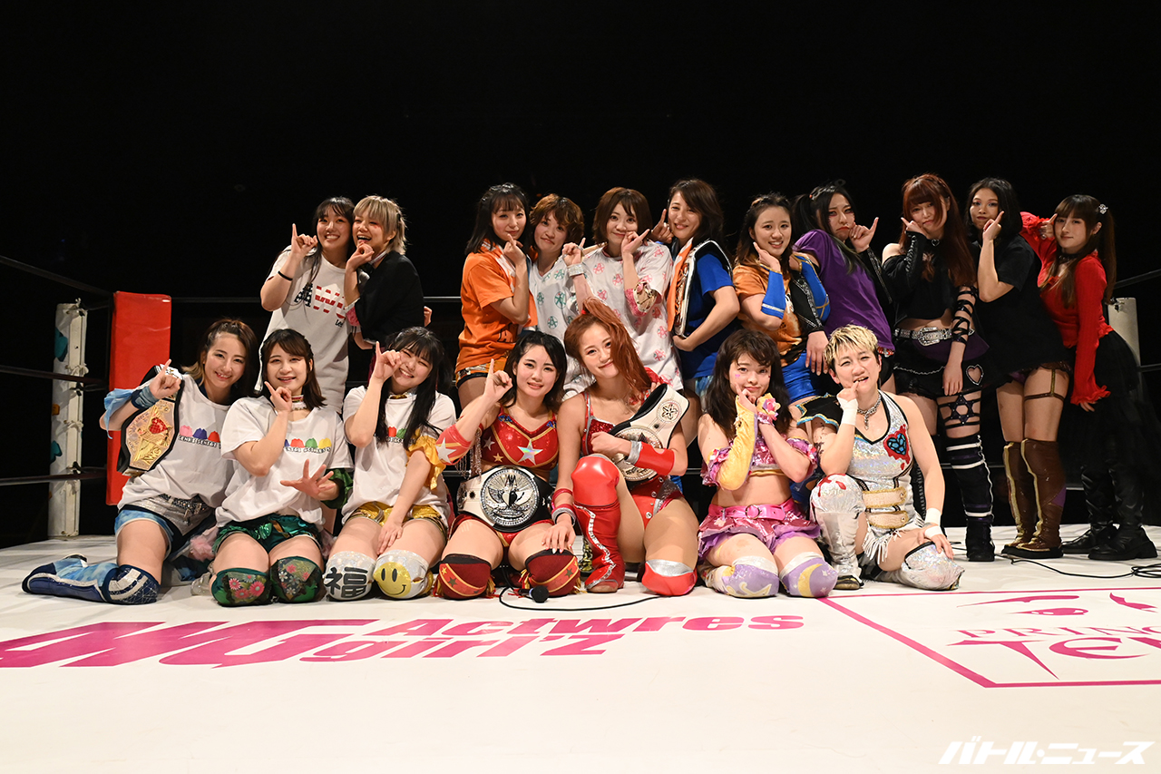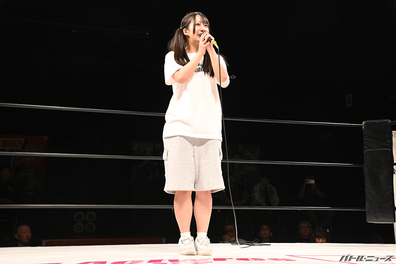 なる「私、アクトレスガールズに茉莉乃を誘ったんですね。で、はいってくれて、今ファイブのリーダーとしてタッグのベルトも持ってて、身長155cm。今ファイブに誘ったのも、摩利乃なんですよ。で身長が155cmなんですよ。で私も155cmなんですよ。マリノと縁があるってことで、お願いします是非こちら、これから次の試合からよろしくお願いします。ガウンも全部渡します。ピンク担当頑張ってください摩利乃の応援をよろしくお願いします!」
