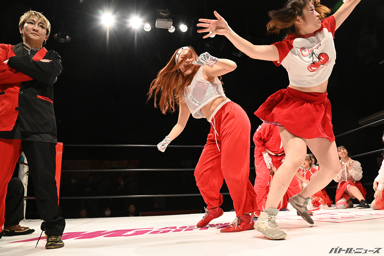 梨央は「茉莉さんを助けようと思って・・・」と言い訳するが、茉莉はブチ切れて走り込みエルボーから髪を掴んでいくが、さくらがロープに飛んで茉莉の背中にドロップキック。