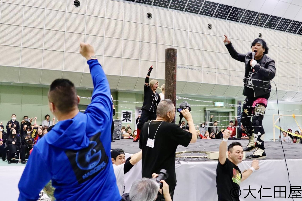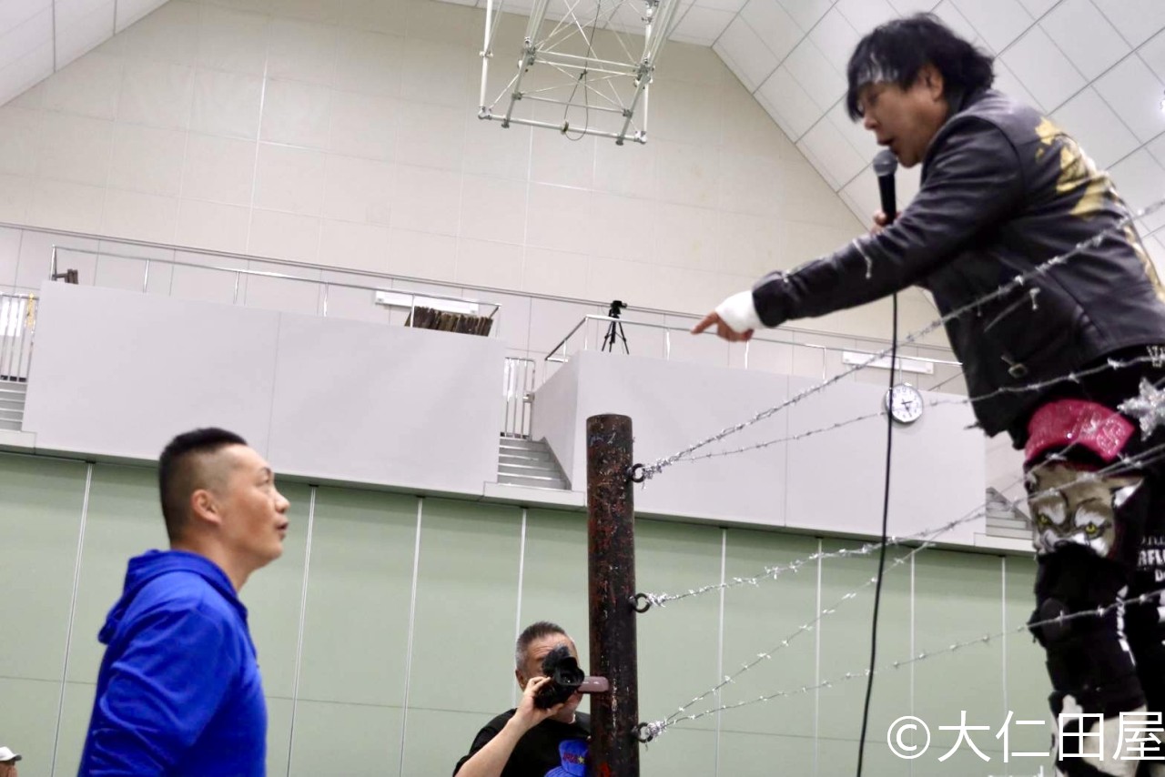 左肩鍵盤断裂などの手術を11月に受け、長期欠場中のCIMAは、順調な回復を見せ復帰に向けてギアを上げているさなか。「大阪府堺市出身、堺市在住のCIMA、自転車でやってきました!」とマイクで挨拶したCIMAは、「いつ、ビッグカムバックをすれば良いのか考えていた。大仁田さん!5月5日FMWEの堺大会に、ぜひ、このCIMAをブッキングしてくださいよ!」と大仁田に参戦を嘆願。会場中からレスポンスを促す大仁田コールが湧き起こる。大仁田は「おーいCIMA、よく聞け。電流爆破で肩を治してやろうか?」とニヤリ。「CIMAがんばれ!1、2、3、ファイヤー!」でリハビリに励むCIMAに激励のエールを送った。