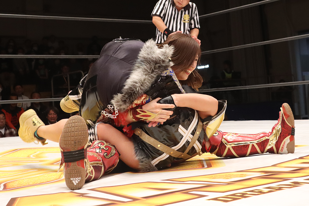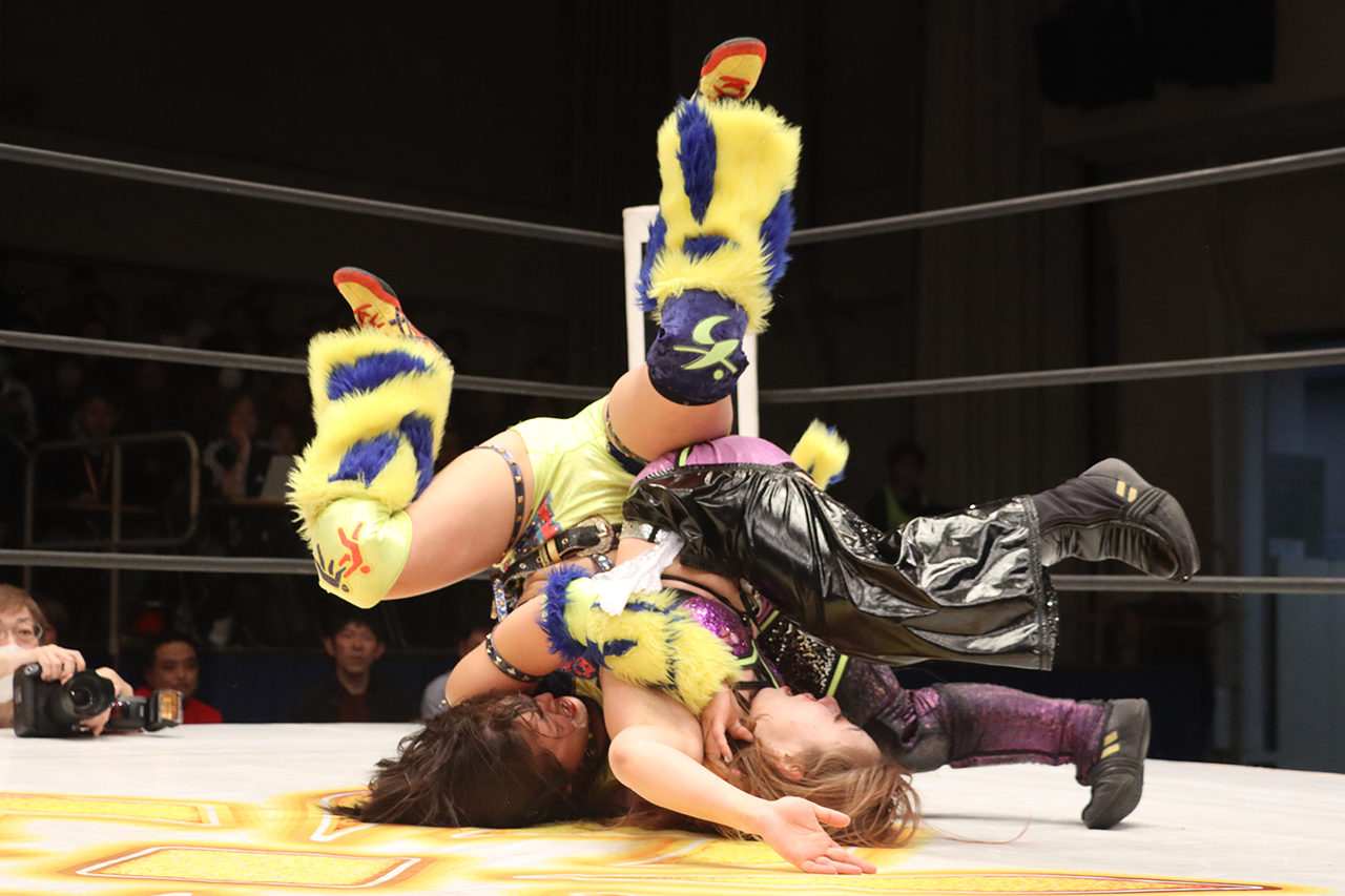 心希はサソリ固めで捕らえようとするが、小桃が切り返して片逆エビ固め。心希はロープを掴みブレイク。