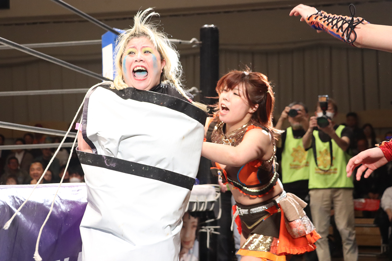 聖怜が担ぐが山崎が丸め込むも、切り返した聖怜に小桃がミドルキック。さらに山崎と小桃でダブルドロップキックから、山崎がブレーンバスターで叩きつけてフォールも2。