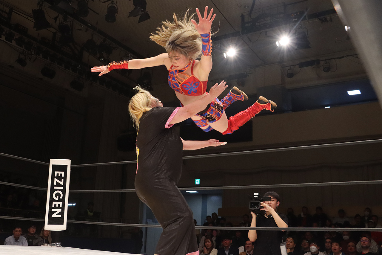 エルボーの打ち合いから小桃がロープに飛ぼうとするが聖怜が髪を掴んでエルボー。小桃がエルボーからロープに振るが、聖怜はドロップキックを突き刺し心希にタッチ。