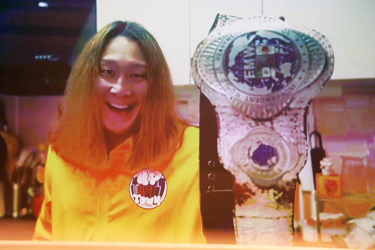 弓月「はい、皆さんありがとうございます。無事、4回目の防衛に、成功しました!おいゴチカ、何笑ってんだよ。そうだね、皆さんの言う通り、会見の時とか、ほんと正直、どれぐらい本気でこのベルト取りに来てんのかよくわかんなかったけどさ、今日っ闘ってみて、ほんとにゴチカの思い、めちゃめちゃ、受け取りました。また、いつでも、このベルト、狙いに来てください。まあ、この、立て。この、ぶにゃぶにゃなお腹どうにかしてからな」