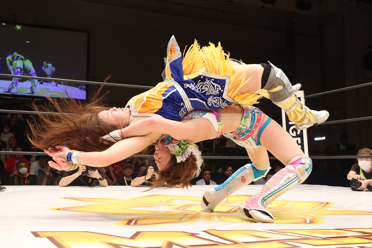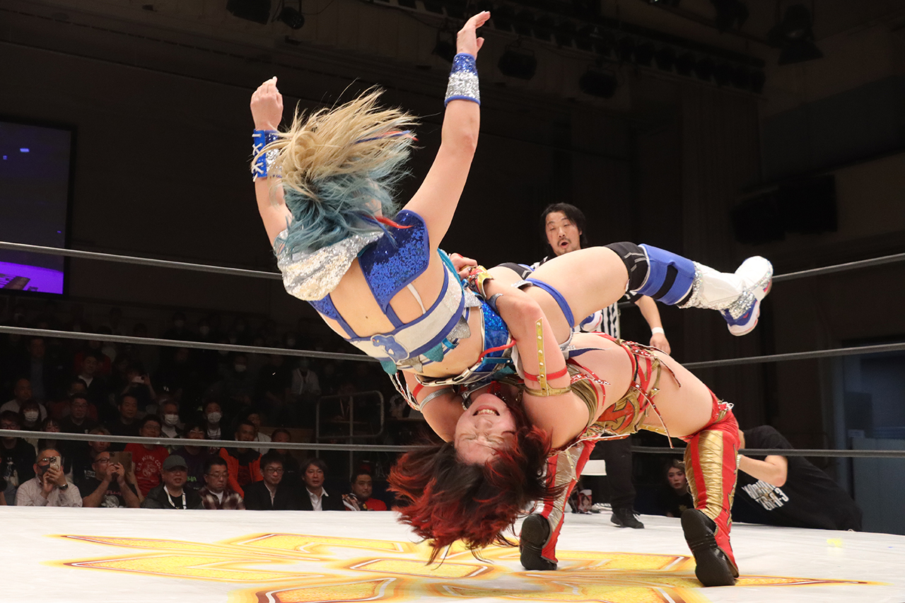 青野はラリアットも、避けたCHIAKIがスピアー。キャッチした青野がスタイルズクラッシュを狙うが、暴れたCHIAKIがサミングから首固めも2。