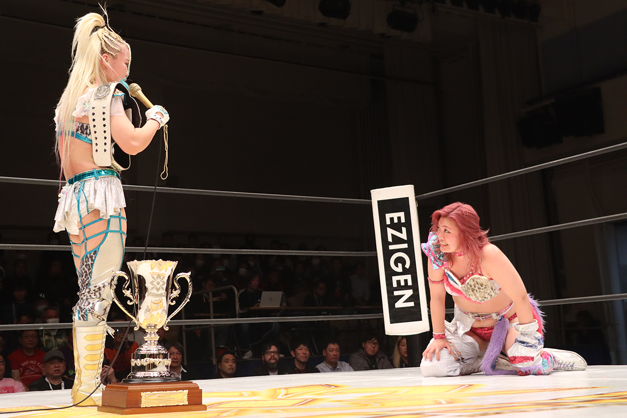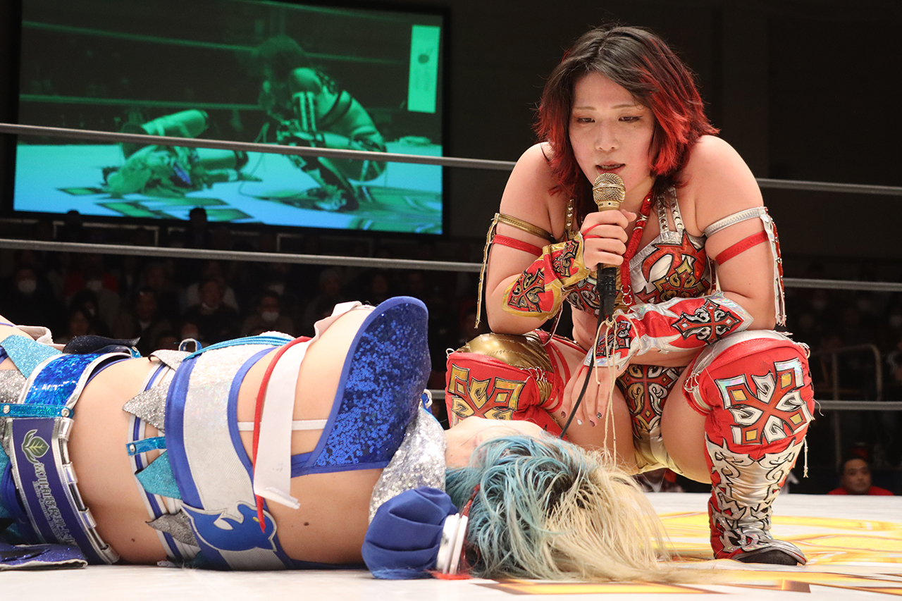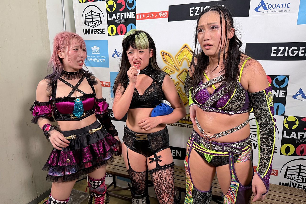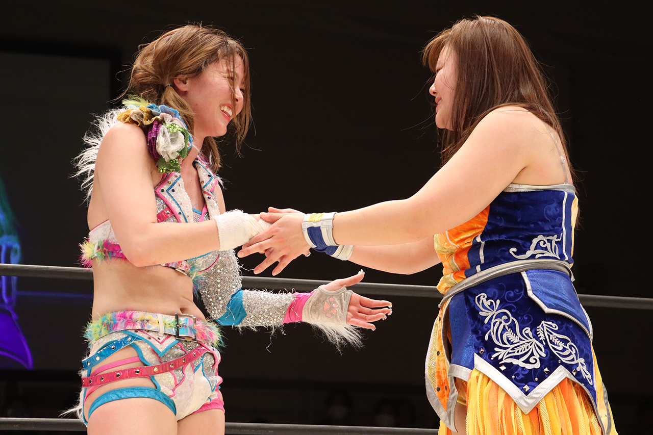 聖怜「今日心希と初勝利、スパンキーモンスターとして初勝利できて嬉しいし、あの2人は近くに住んでるかもだけど、こっちは心が繋がってるし、絆あるし、そこで今日勝てたんじゃないかなって。助けに来てほしい時に助けに来てくれたし、やっぱ絆が一番大事だなと思うし、ベルト目指して2人でどんどん頑張っていきます。ありがとうございました」