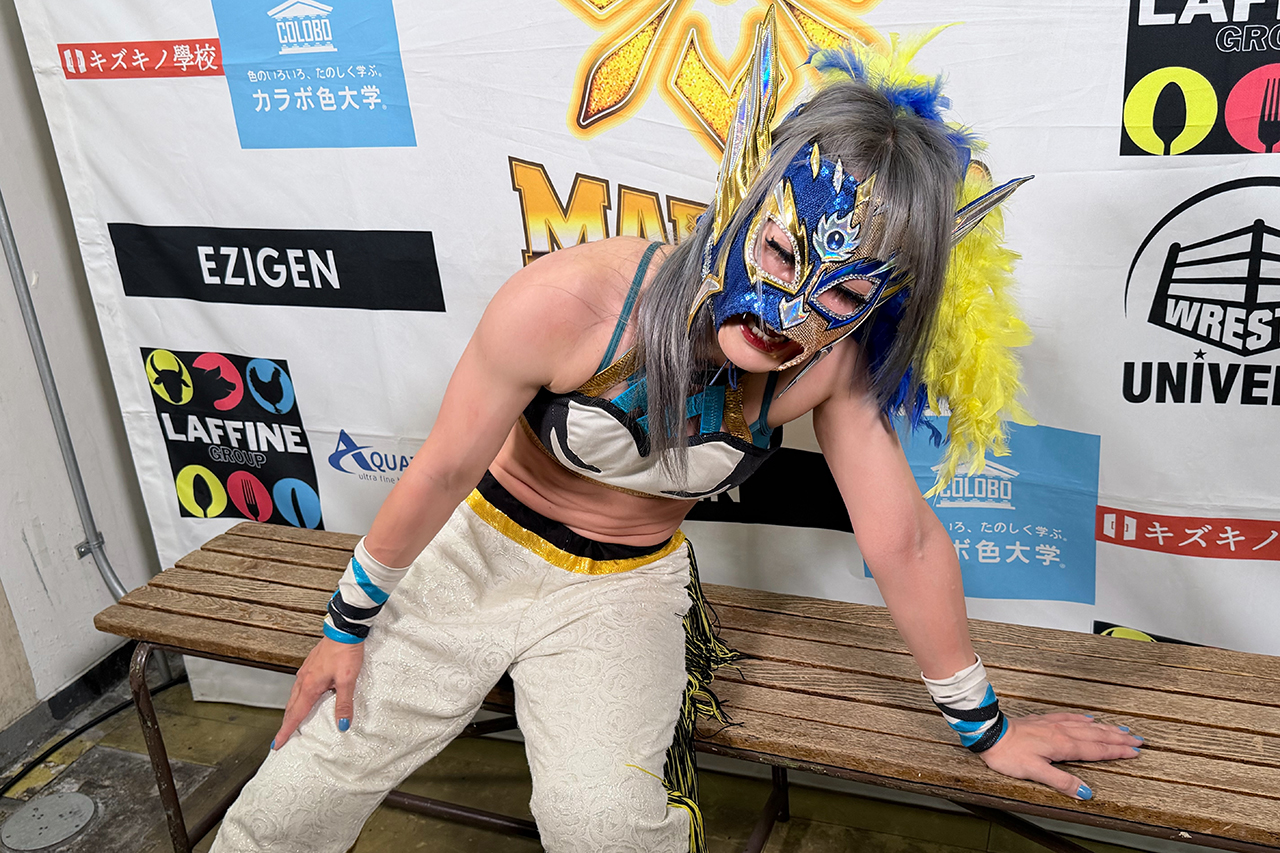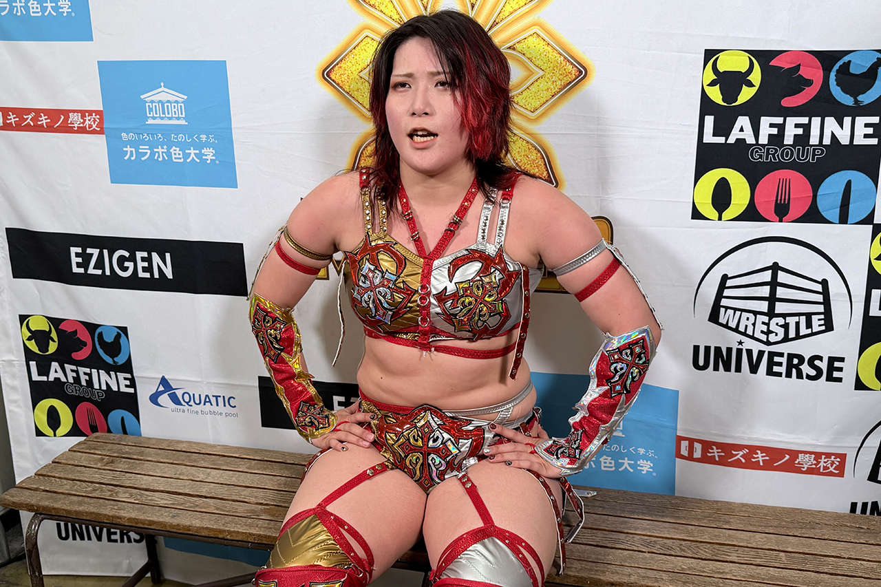 「ありがとうございました。やっぱ、いやまずは、マリーゴールド、小川さん、このカードを組んでくださり本当にありがとうございます。本当に、最後、最後の願いを、ほんとにシングルマッチを叶えてくださいました。本当にありがとうございます。やっぱり、岩谷麻優超えはできなかったです。それだけ麻優さんが強いってことなんですけど、悔しい、なんか悔しいけど、なんだろう?なんか、スッキリしたようなしてないような気持ち、ですね。もう引退しても、麻優さんのファンで追っかけ続けるので、麻優さんが引退するまでずっと追っかけ続けます。それが私の楽しみになるかもしれないですね。はい。まああとは、引退、5月5日マーベラスの横浜BUNTAIで引退するんですけど、なんか最後のやっぱ引退って考えた時に、麻優さんしか私の中で出てこなくて。今回のシングルもお客さんが見たいって言ってたカードだったと思うし、もう一つ私の中でやり残した事があるとするならブルーマリンのタッグだと思ってたので、これはもう麻優さんしかいないと思って今回お願いしました。でも小川さんもOKでしたよね?だったので、はい、これはもう決定ですね。はい。ありがたいです。ありがとうございます」