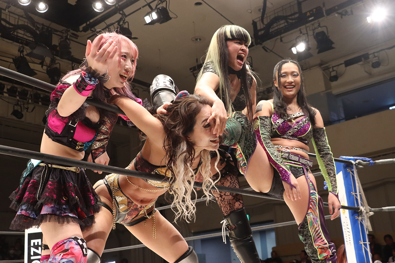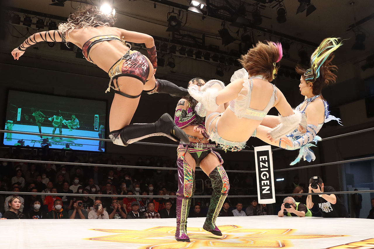 聖怜が山崎にエルボー連打から場外に投げ捨て、心希がロープに飛ぶが小桃がドロップキックで迎撃。小桃は山崎にタッチ。