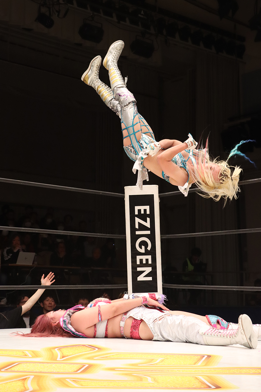 小桃は投げようとするが、耐えた聖怜にソバットからロープに飛ぶが、エプロンから心希が蹴りつけると聖怜がロープに振って心希がドロップキック。さらに心希が聖怜に振って聖怜がドロップキックから、2人でロープに振ってダブルのドロップキックを突き刺す。フォールも2。