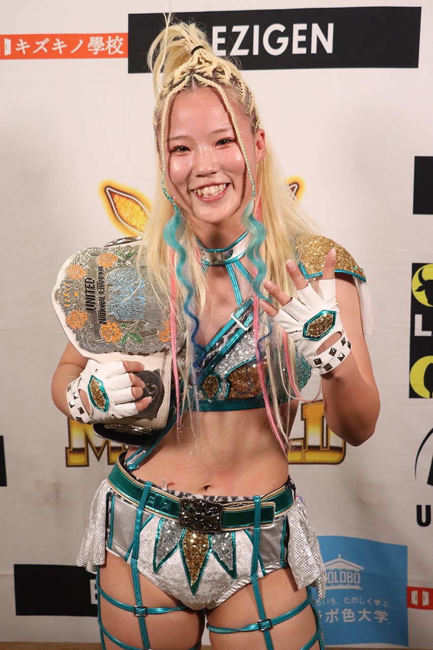 「無事V4達成しましたー!いや、ホントね、マイクでも言った通り、ゴチカがどういうふうにね、どんな気持ちで今日くるのかほんと心配だったんですけど、なんか、なんていうんだろう?このベルトに対する思いというのが、なんかすごい薄っぺらい気がしてね。だからでも、なんだろうこういざやってみて、ほんとにゴチカが、会見でも言ってた通り凱旋でね、ベルトを持って帰りたいと。その思いが一番今日伝わりましたし、きっとゴチカもこのタイトル戦線に絡む、なんていうんだろう?こういう、そういう思い、このベルトもね、狙ってきてくれると思いますので、今後のゴチカにもね、期待したいと思います。私はね、このベルトまだまだ輝かせていきたいと思ってますし、まだまだこのベルトでやりたい目標、達成したいこと、沢山ありますので、皆さん今後の私にも、そしてこのユナイテッドのベルトにも期待しててください。マリゴでユナイテッドが一番面白いベルトだとこれからも見せていきます。ありがとうございました」