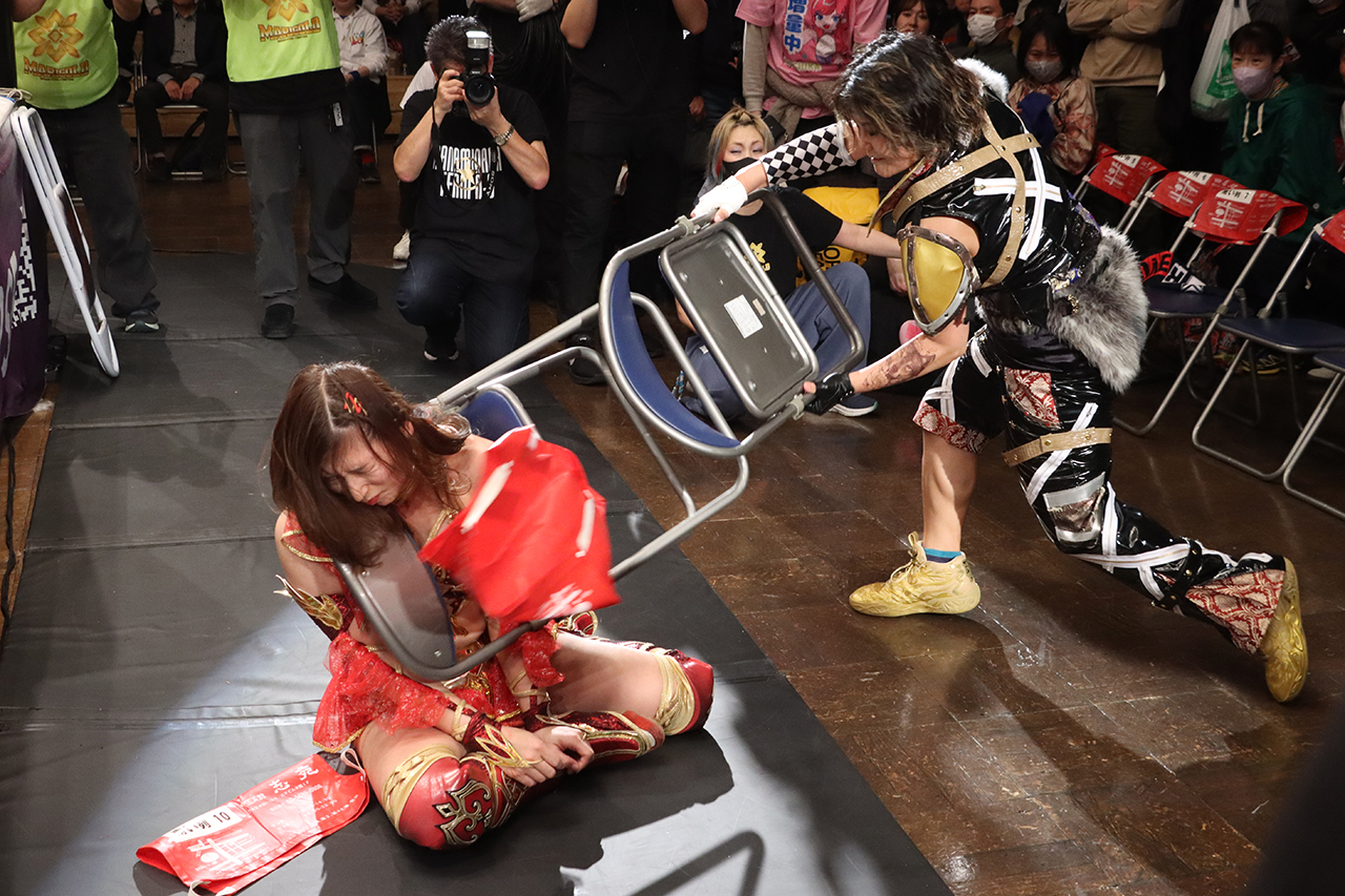 青野は投げようとするがCHIAKIはレフェリーの手を掴んで耐え、青野はCHIAKIの背中にハンマーブローからロープに飛んでショルダータックルも、CHIAKIがレフェリーを盾に。動揺する青野にCHIAKIはスピアーからイスを振りかぶるが、青野がキャッチするとCHIAKIはガットショットからイス攻撃。避けた青野のボディに再度イス攻撃から、脳天にイスを叩き込む。