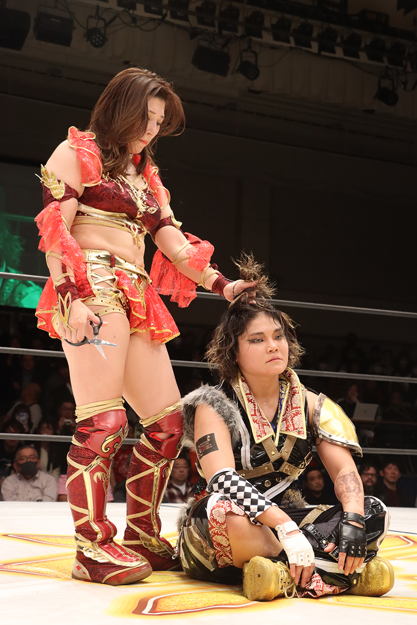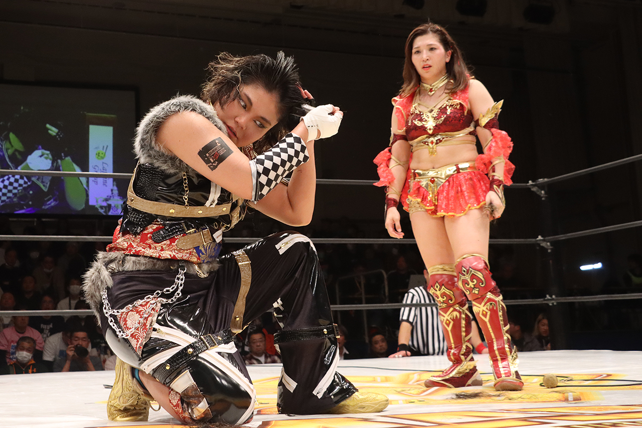 CHIAKIは客席に叩き込み再度髪を切ろうとするが、小桃が羽交い締めにすると今度は小桃の髪を切ろうとする。これも阻止されるとリングへ戻るが、すぐにCHIAKIは青野を場外へ転がす。