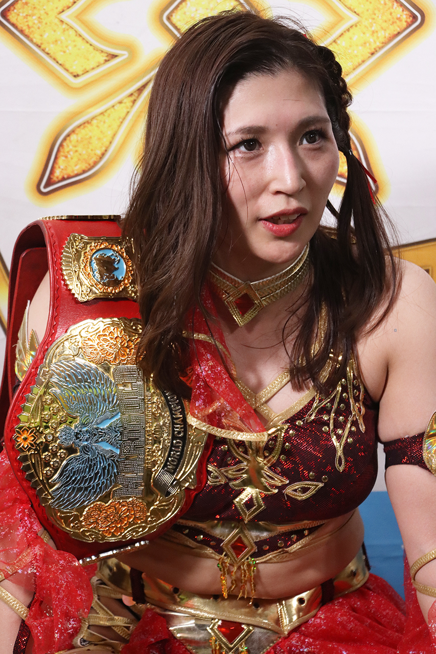 「ワールド王座、2度目の防衛戦に成功しました。こんな形でタイトルマッチ、するなんて思ってなかったけど、でも、私は、この、CHIAKIの髪の毛・・・こんな、あんな汚いやつの髪の毛なんてって思ってたけど、やっぱり同じ女として、あいつにとっても、大事なものを、まあ結果的には賭けてくれたと思っています。だから、だから、私はこの闘いを、誇りに思って、そしてこの覚悟、この覚悟に負けない覚悟を持って、このベルト、もっと輝かせていきたいと思います。しっかり、今回私らしくなくなったと思ったけど、これも自分だと、自分で受け入れて、そしていろんな自分をこのリングで出していくのがいいのかなって、CHIAKIのおかげ?感謝はしてないけど教えてもらいました。これからも、色んな私を見せて、そして私らしく突き進んでいきます。これからもよろしくお願いします。ありがとうございました」