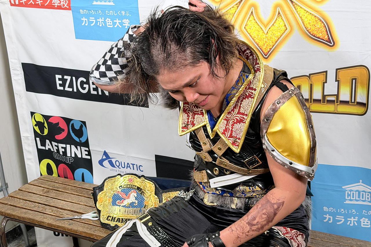 だがCHIAKIは「タッグは俺らの聖域だよ。次はお前に恥かかせてやるからな」と自ら髪にハサミを入れていく。さらに松井からバリカンを受け取り、頭にバリカンを入れてリングを去った。
