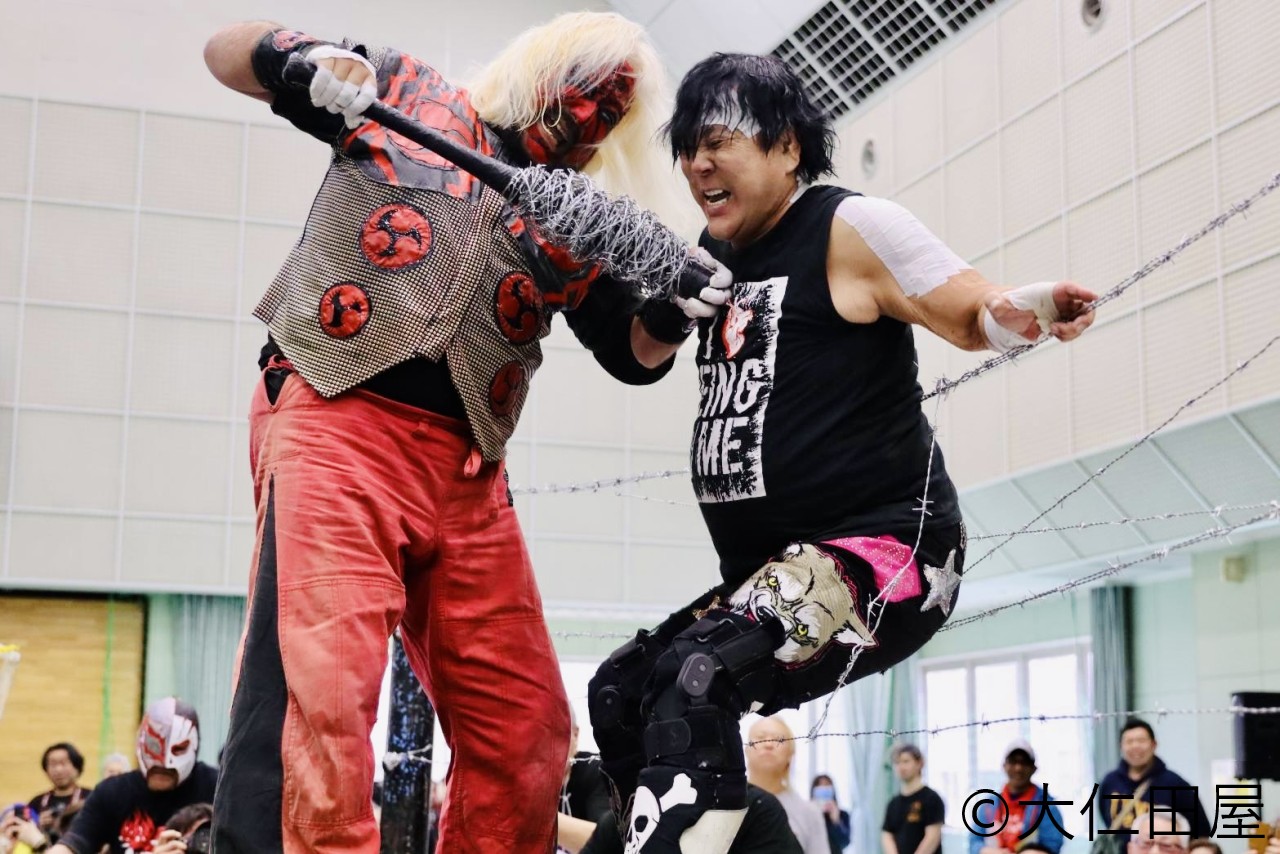 序盤から大仁田がノーロープ有刺鉄線に投げられたかと思ったら、大仁田が反撃に出るやスミを捉えて有刺鉄線の山へDDOを見舞う。さらに大仁田組全員で、矢口を脚立に立てかけた有刺鉄線ボードに押し込み、大仁田組優勢で試合が進む。しかし矢口、スミが藤永を捕らえ、有刺鉄線ボードへのダブルブレーンバスターから、キックとエルボーによるサンドイッチなど、好連携で攻め立て、最後はスミが有刺鉄線を脚に巻いたバズソーキックで、藤永をマットに沈めた。