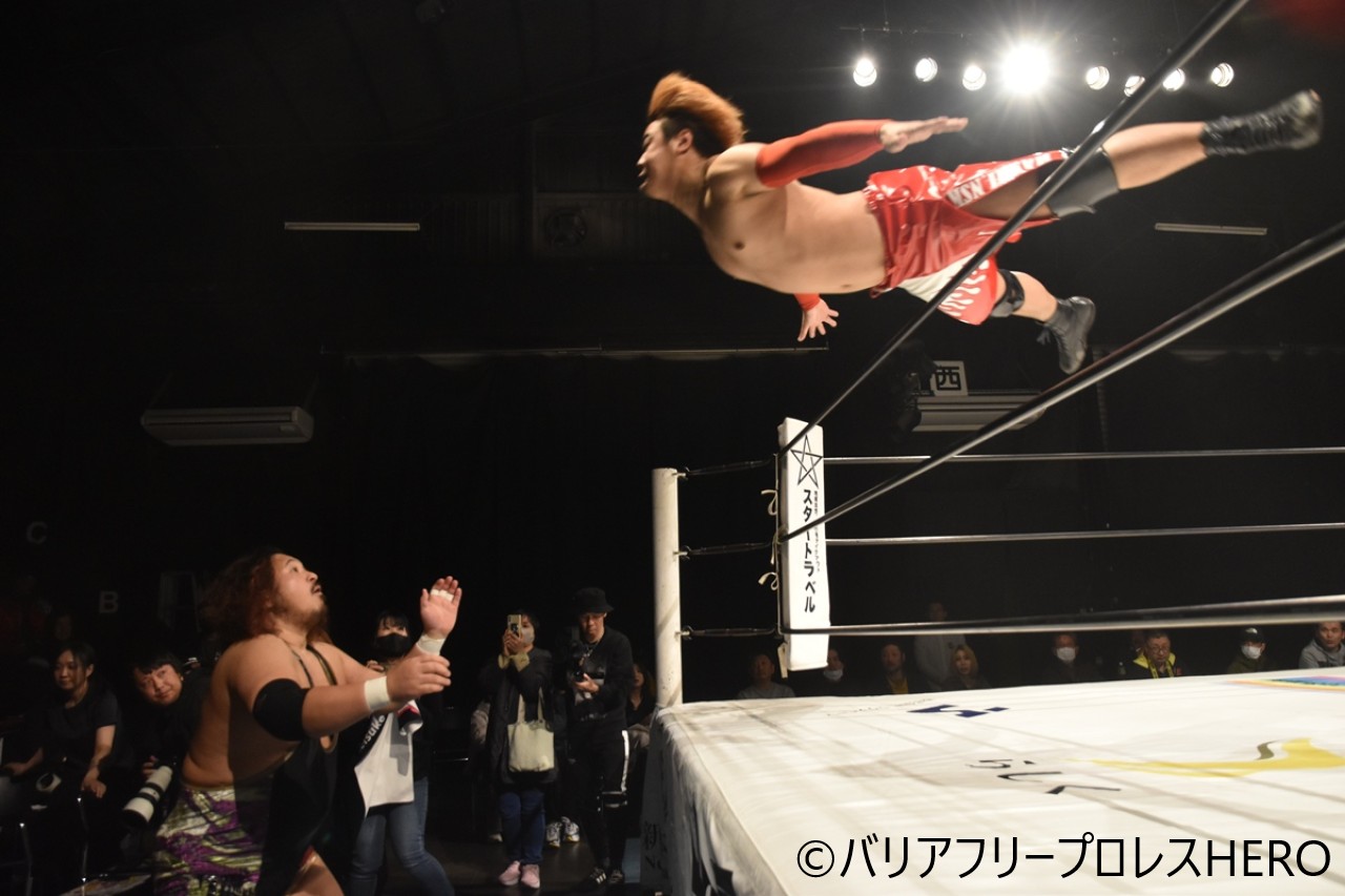 シングル・トーナメント1回戦の初戦で後藤と橋之介が激突。橋之介は開始早々、ノータッチ・トペコンヒーロを発射。リングに戻ると、橋之介はスワン式ミサイルキック。後藤は串刺しラリアット、セントーンで反撃。橋之介がみちのくドライバーⅡも2カウント。後藤はラリアット、バックフリップからジャックハマーでトドメを刺した。「橋之介とシングルは初めてで。HEROではタッグベルトをかけて戦う予定もあったんですが、自分がケガしてしまって。止まってたものが動いたのかなと思います。2回戦でどっちが来ても今勢いがあるのは自分なんで。どっちが来てもぶっ潰してやります」(後藤)