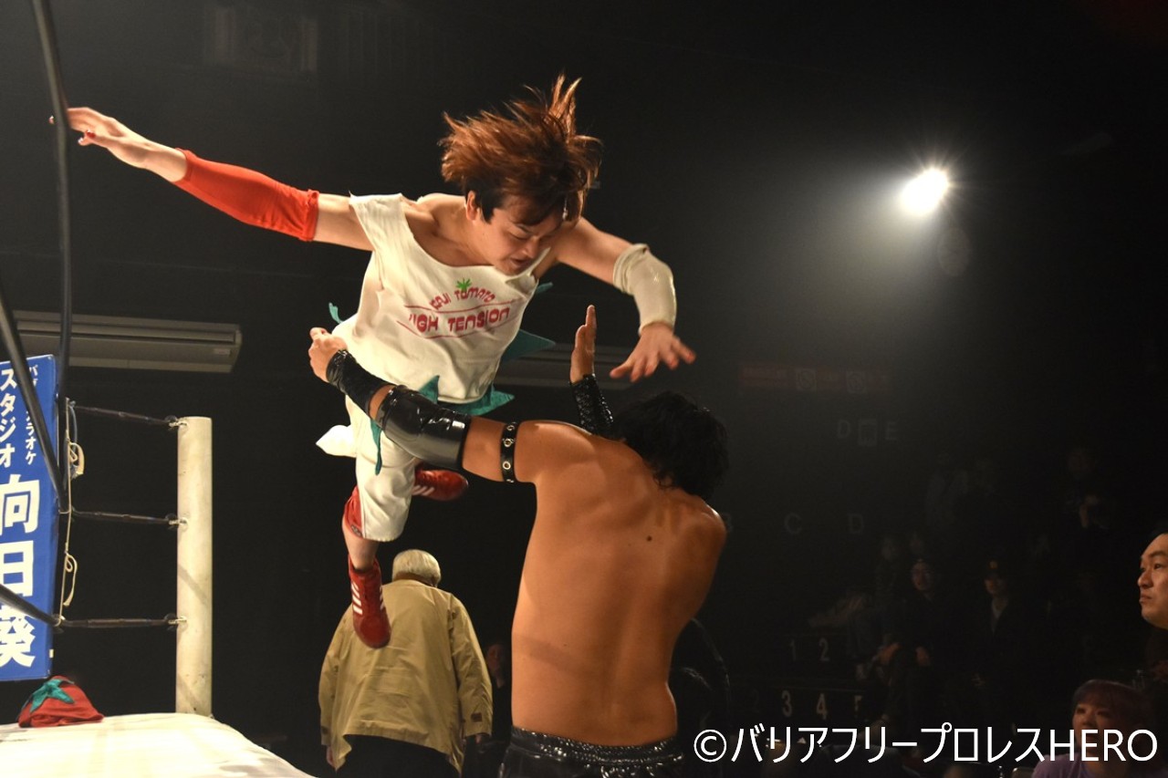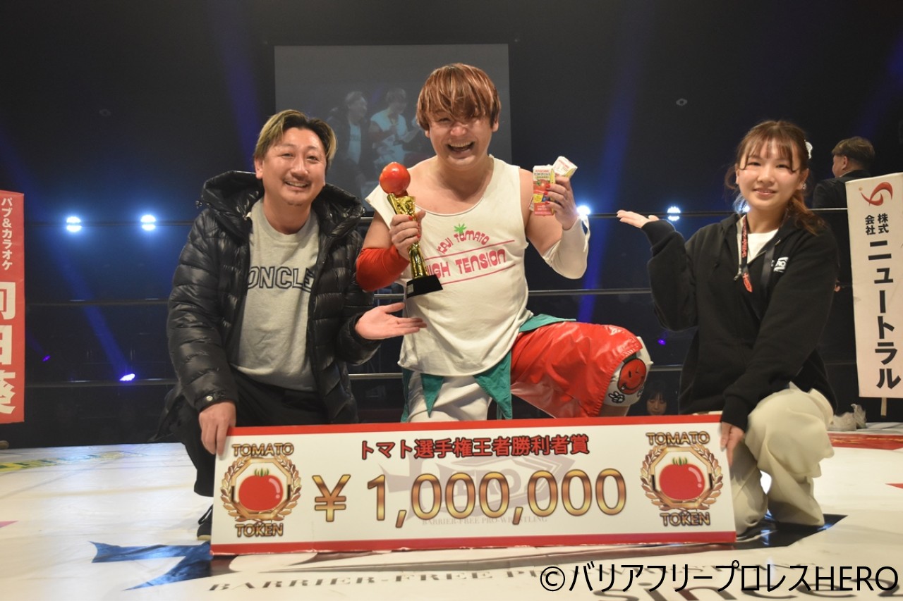 果てしない抗争が続く峰雄と梶がトマト選手権で激突。国歌斉唱、トマト王座実行委員会・岡田政紀氏により認定宣言。厳粛な雰囲気のなか、まずは峰雄がマンハッタンドロップ。梶はプランチャ。梶はトップロープに上るも峰雄がロープを揺らし、梶は股間を痛打。丸め込みの応酬から、レフェリーのブラインドを突き、峰雄が急所蹴り。梶はトラースキックからタイガースープレックスで3カウントを奪取。梶が王座奪還に成功した。勝者の梶にはHEROアンバサダーのMioさんからトロフィー、100万トマトTOKENが贈呈された。