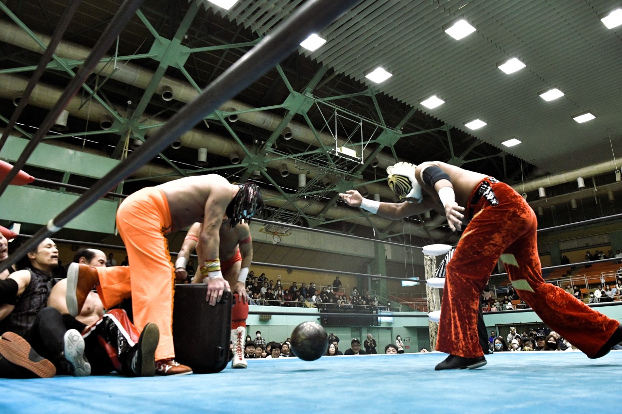 リングに戻ればタイガーをコーナーポストに押し込んでスーツケースを股に突き刺し「ボーリング!」ボールを片手にあわやというところでカットに入ったサスケがシュウをコーナーポストに押し込んでスーツケースをねじ込みボールを投げようと構えると、なぜか落としてしまいもたもたしているとケイがカット。ケイを蹴散らした市原から郡司が手にしたボールを1周まわって獲得したタイガーが、バラモン兄弟と郡司をまとめてボーリングの刑に処した。