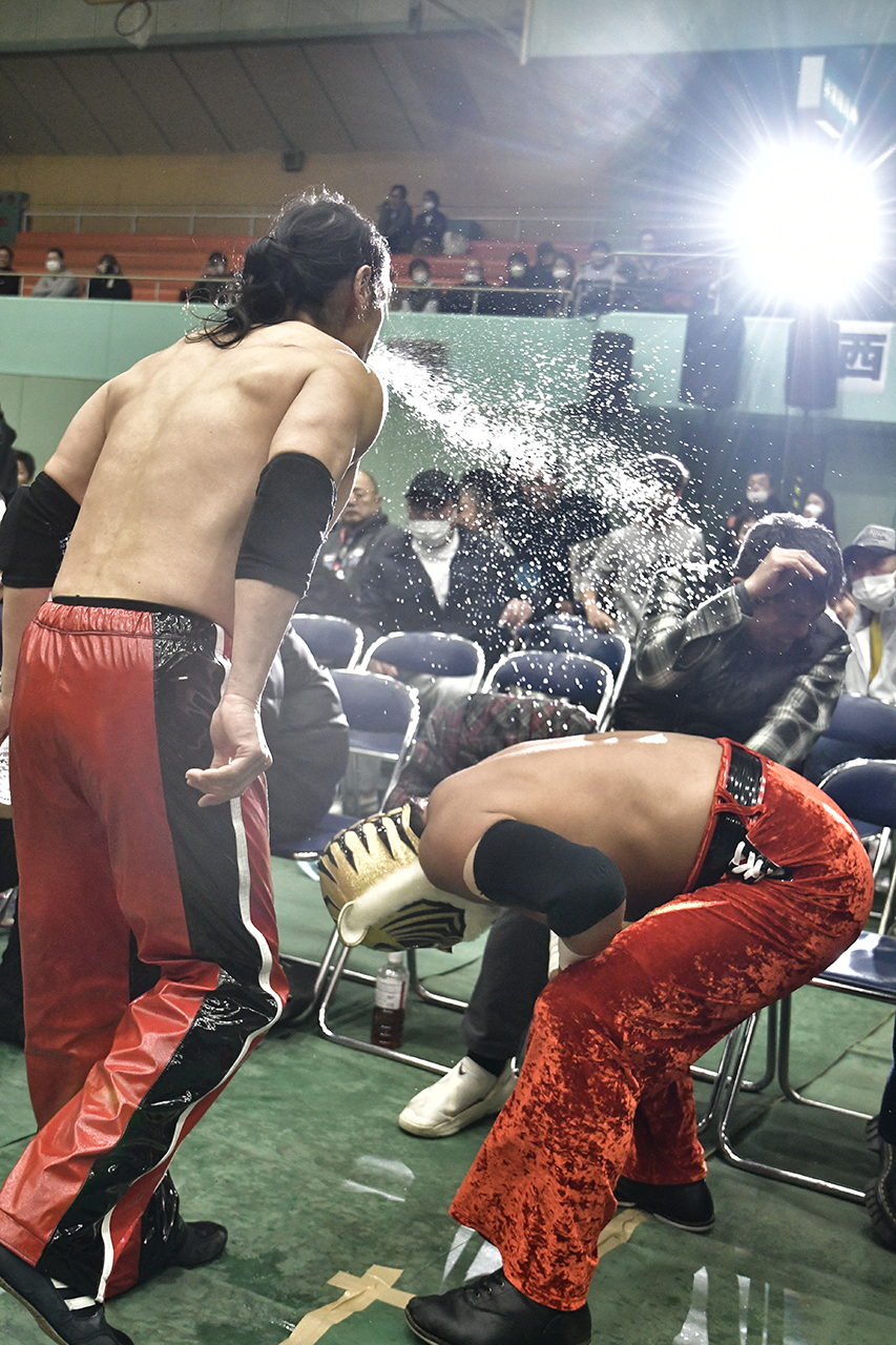 その後はサスケがシュウにトぺ・アトミコを交わされ自爆するも市原が躍動。ケイに羽交い絞めされてシュウが投げたスーツケースを逃れてかわして誤爆を誘ったあとシュウをランニング・ネックブリーカーで華麗に駆逐。すると4月より1年間メキシコへ修行の旅に出る郡司が猛攻を仕掛ける。タイガーにダブルニードロップ、ブルドッキングヘッドロックと、旅立ち前最後の徳島で怪気炎あげフォール。しかしサスケがカットして、タイガーがローリング・ソバットからトラースキック。とどめのタイガードライバーで3カウントを奪取。