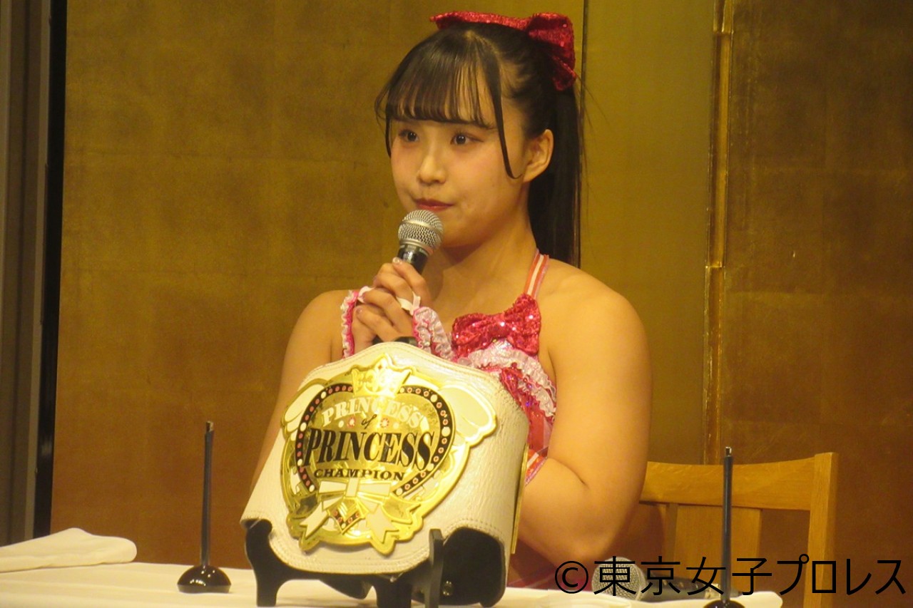 最後に「3度目の両国国技館のメインイベントでプリンセス・オブ・プリンセス、私が勝って、さらに東京女子プロレスを引っ張っていきたいと思っています。ここからもっともっと強くなっていく。東京女子プロレスを私がこれまでも命をかけて、このベルトに命をかけて、東京女子プロレスに命をかけて全力でやってきました。ここから先も私のこの愛のしるしを、私の特別を譲るわけにはいきません。渡しません。私についてきてください」とベルト死守を誓った。