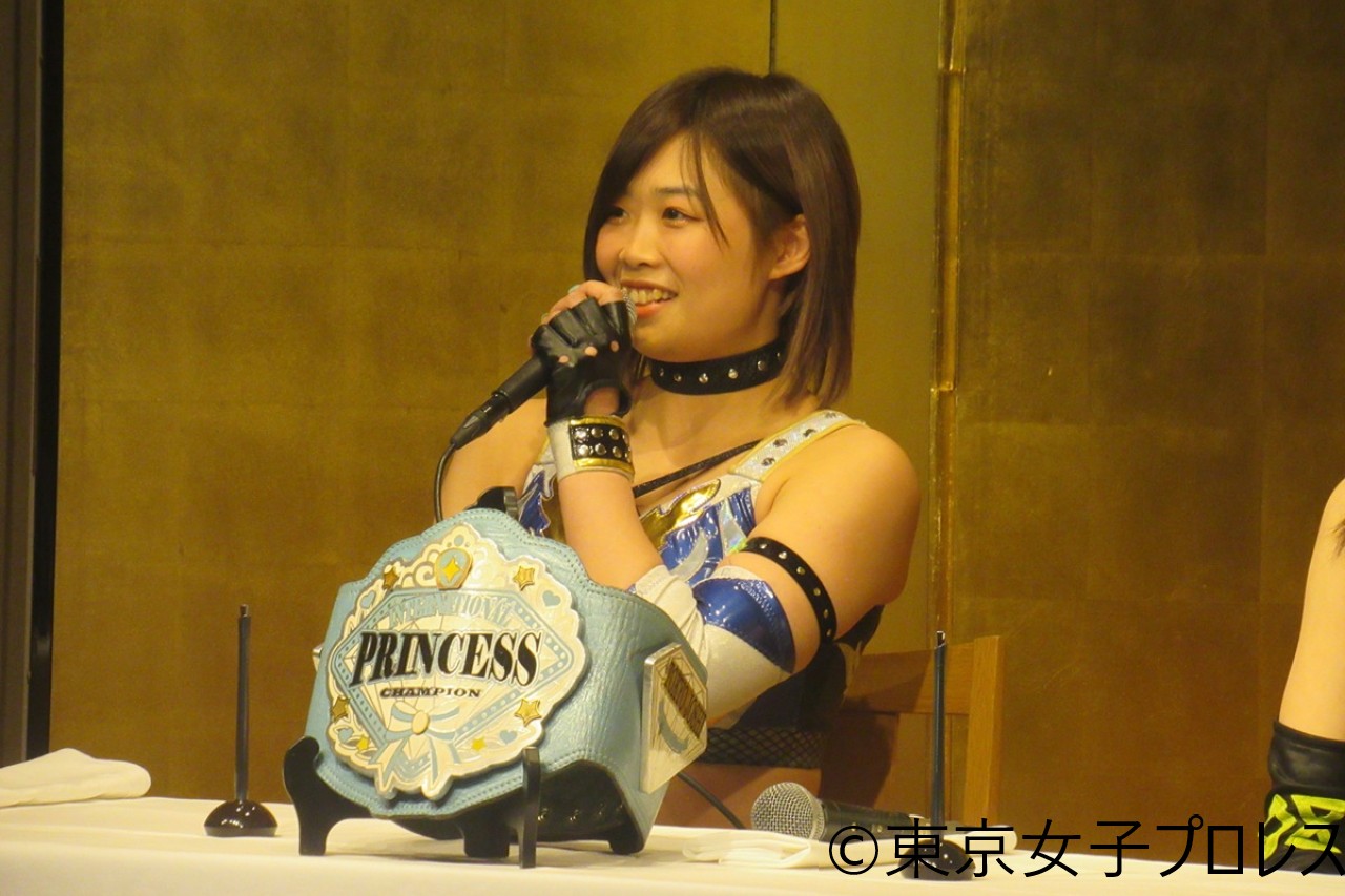 王者のMIRAIは「今、インターナショナル・プリンセスのベルトが自分のもとにあって。同期の鈴芽と両国で防衛戦できるっていう状況。ちょっと前の自分が聞いたら驚くというか、ちょっと前の自分からしたら想像できないことだなって、すごく思ってます。鈴芽と前哨戦を戦ってみて、あの頃とは違って、鈴芽の一刺しって言うのかな? すごく威力が上がってて、そこはビックリしたんですけど、いろんな面ですごくやさしさを感じます。今の話を聞いてても、すごくやさしさを感じます。けど、本当はそれだけじゃないんじゃない? 悔しさとか、いろんな感情をぶつけたい気持ちがすごくあるんじゃないかなって感じます。分かるよ、鈴芽の心の中。だからやさしいだけじゃない。笑顔が似合うって言われる2人だけど、笑顔なだけじゃない。もう心の中のすべての感情をぶつけ合う。そんな試合を両国でしたいなと思ってます。そして自分自身、東京女子プロレスでデビューして、まだまだあの時育ててもらった恩返しができてないので、両国でしっかりこのベルトを防衛して、もっともっと東京女子プロレスを世界へ伝える役割をしていけたらいいなと思ってます」と王者としての自覚を見せた。