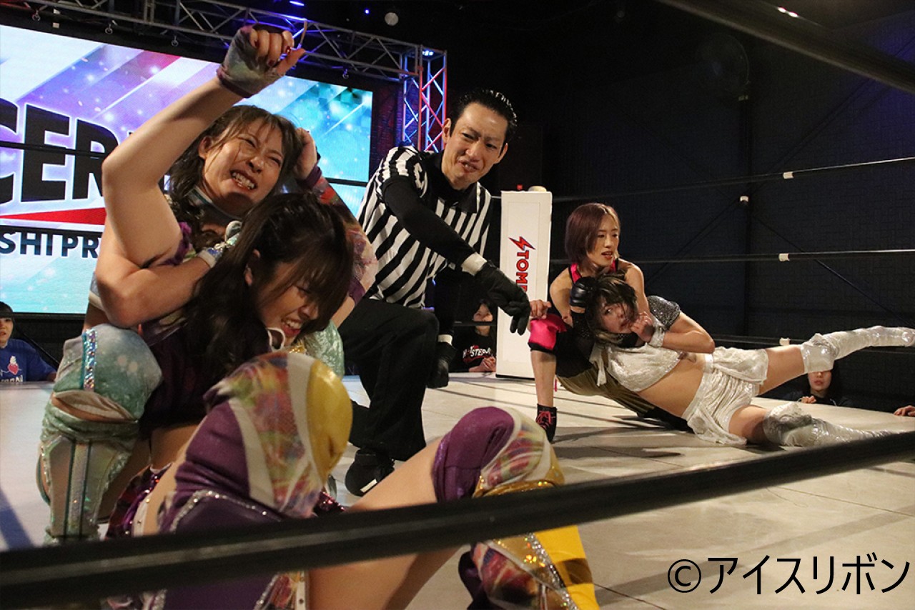 そして、最初に入場してきた優華が海乃、柳川、楓歩の入場を急襲し、3人からICE×∞、リボンタッグ、FantastICEのベルトを奪い、リング周りで逃げまくるが、海乃、柳川に捕まり、ロープにはりつけられる。そこに楓歩がミドルキックを連打するお仕置きを受けての試合開始。ダメージ大でリングに戻った優華を楓歩がボディスラムでカバーもカウント2。