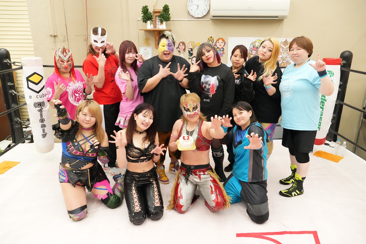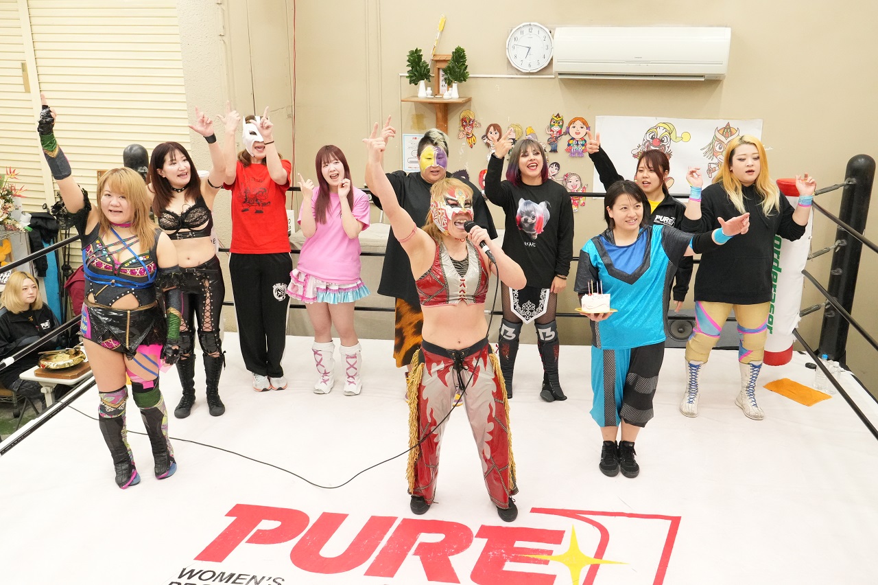 最後にLeonは「ちえは7年前のライオンハートが初めてのプロレス観戦で、私が誘ってプロレスラーになってデビュー戦の相手も務めた思い入れのある後輩の1人。春日は私が無差別のベルトを巻いてた時に後楽園のメインで闘ったし、タッグのベルトでも何度も何度も闘い合ってきて。これからもやり合っていきましょう。そして中森、もう15~6年前…当時、私が主宰していた『獅子の穴』(※団体の枠を超えて若手の底上げを目的に活動)で初の弟子だったんだよね?そこからずっとJWPからPURE-Jに変わっても、ずっとバチバチ1番やり合ってきてる後輩なので。今日はこの4人で記念試合できて嬉しかったです。いま中森は2冠王ですけど、いつでも狙ってるから。そこだけは覚えといて?27年目も努力を怠らず強い背中を後輩たちに見せていけるよう頑張りますので、応援よろしくお願い致します!」とあいさつ。Leonにケーキが贈られて大団円となった。