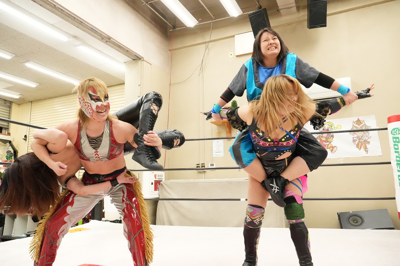 15日のPURE-Jの亀アリーナマッチは、デビュー26周年記念日となるLeonのプロデュース大会『ライオンハート』として開催された。メインイベントでは主役のLeonが大空ちえとのタッグで、中森華子&春日萌花と激突。中森&春日はLeonに的を絞って大技攻勢を仕掛けるも、ピンチを脱したLeonは大空とのファンタスティックフリップからマッド・スプラッシュへ。中森との丸め込みの応酬を制したLeonが、記念試合を自らの勝利で飾ってみせた。