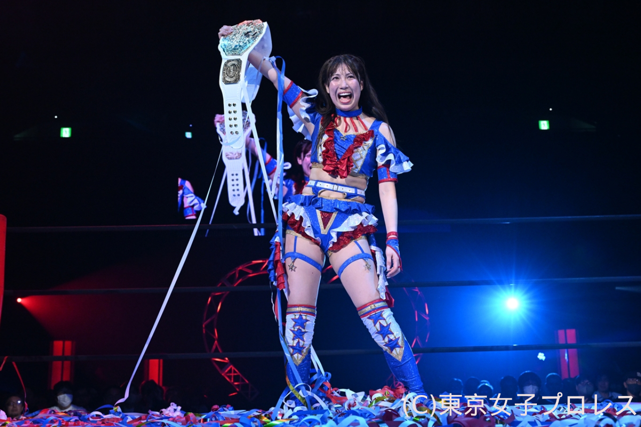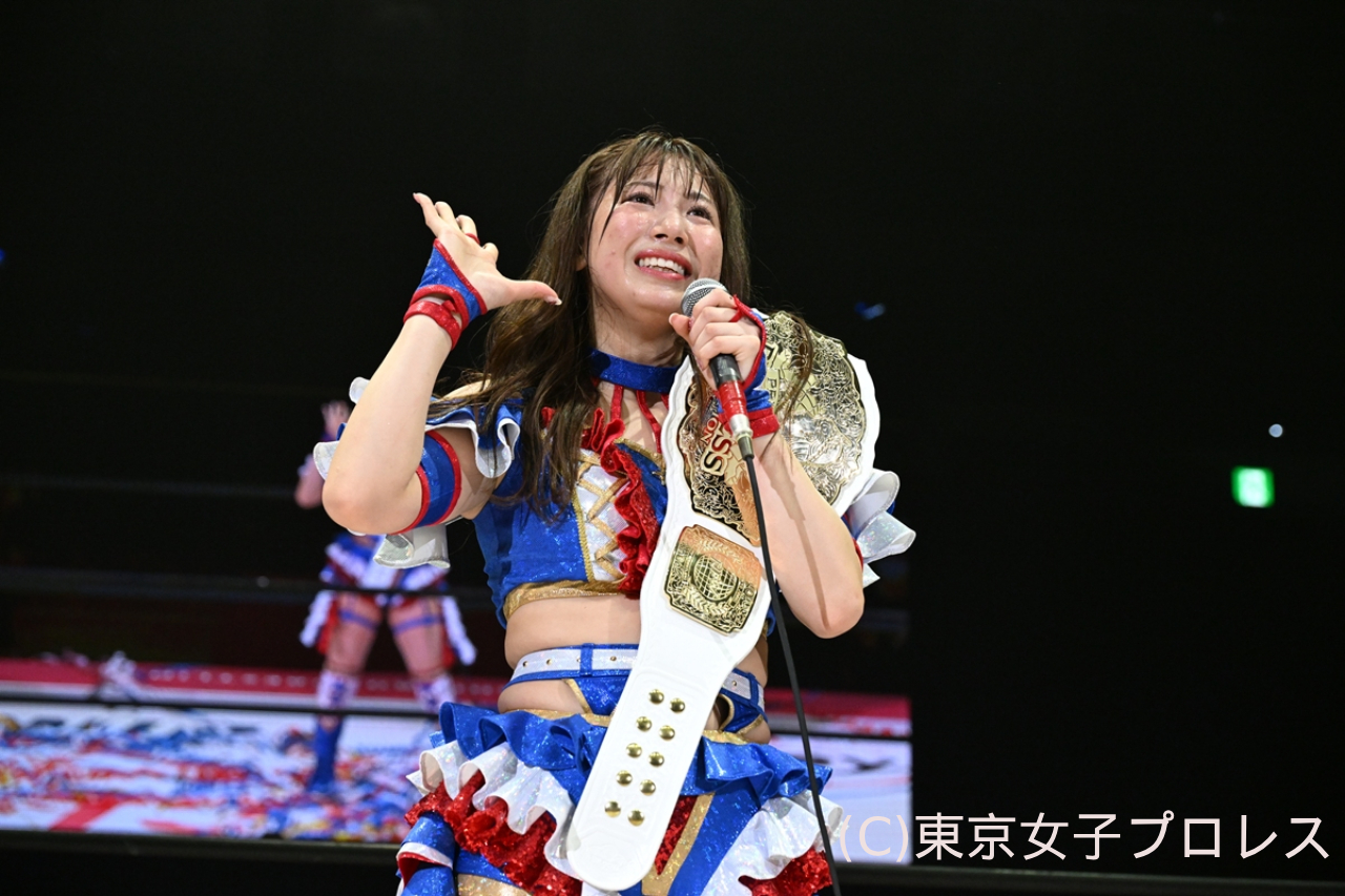 最後に荒井は「私、チャンピオンになったら、どんなチャンピオンになりたいかなってたくさん考えたんですよ。見つけました。荒井は夢を見るチャンピオンになりたいです。そして、大好きな仲間に夢を語りたいし、みんなで夢を叶えたいし、東京女子を愛してくれる皆さんに夢を見せたいです。私の夢があって、それは東京女子プロレスがもっともっとたくさんの方に愛してもらって、選手みんなで東京ドームで興行することです! すごくこれを言うのは勇気がいるけど、みんなの前で言ったので、一番バカみたいに私が夢を見て、みんなに信じられないような景色を見せたいと思うので、これからも東京女子プロレスをよろしくお願いします!」とマイクで締めくくった。