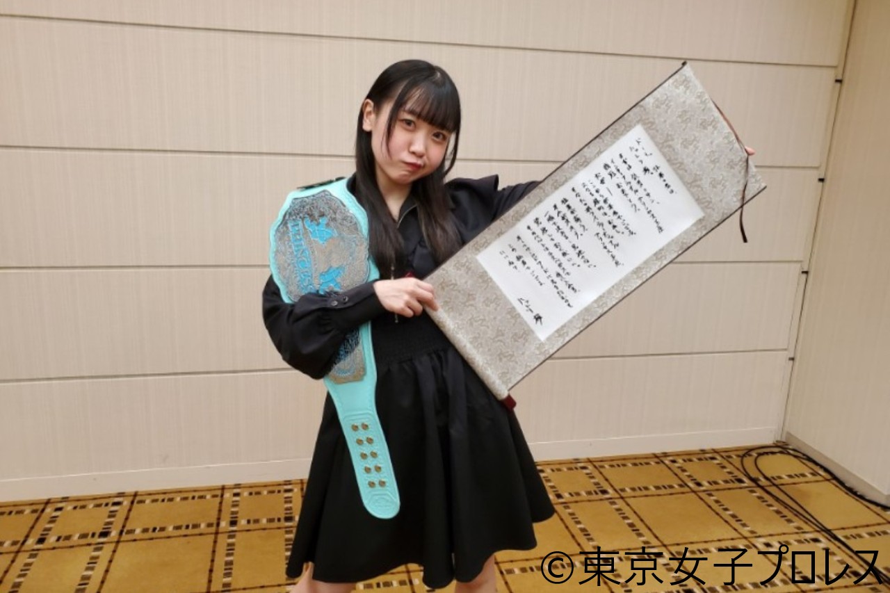 鈴芽は「正直、まだ体中が痛くて、昨日のダメージが、MIRAIの強さが全身に残っています。それでも自分自身のすべてをかけて、この(新調された)新しいベルトを獲ることができました。東京女子プロレスの両国国技館大会、本当にいろんなものが詰まった一日で、自分の試合が来るまでに、みんなの試合からものすごいパワーをもらいました。何より応援してくれるみんながいて、最高の両国国技館になったと思っています。この東京女子プロレスを、今見てくれているみんなと一緒に世界中に届けていきたいと改めて思いました」と振り返った。