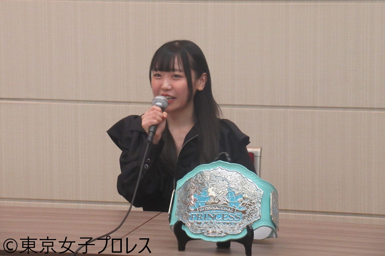 東京女子プロレスが3月30日、都内で記者会見を開催した。前日に両国国技館で同期生・MIRAIを下し、インターナショナル・プリンセス王座を奪還した鈴芽が一夜明けた心境を語った。