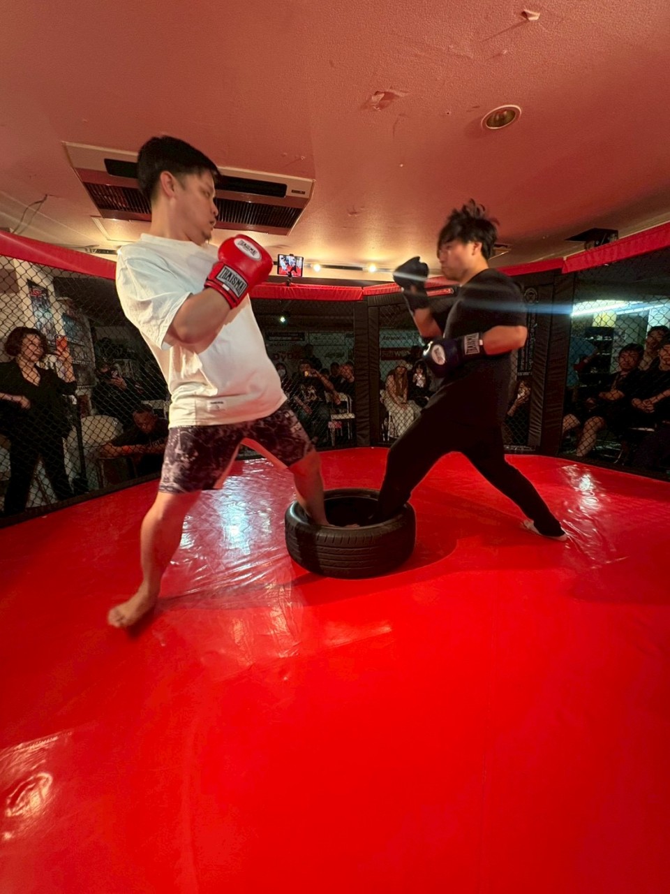 1R 勝者喧嘩四つの為、コイントスで構えを選ぶ。まずはオーソドックススタイルのにっけん君がコイントス勝利。有利な状況で試合スタート。開始早々、にっけん君得意の左フックなど猛攻。それをウェービングでなんとか交わす菅野。ボクシング経験者だ。しかし、1つ目のタイヤアウトのコール。しかし、これはにっけん君のプッシュとなりノーポイント。