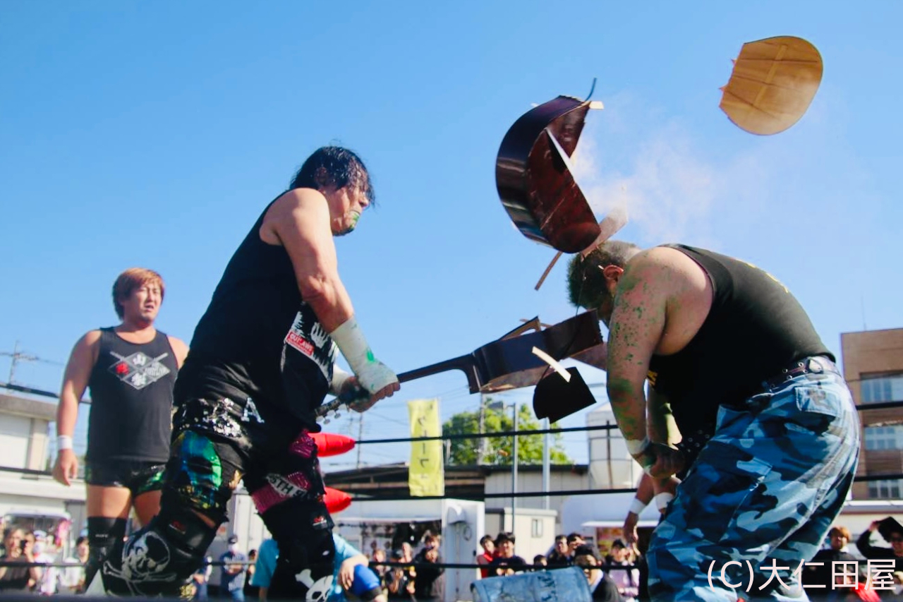 大仁田は佐藤と連携を取り、シャークへダブルブレーンバスターでダメージを与えると、最後は電流爆破バットを叩き込み、シャークをマットに沈めた。