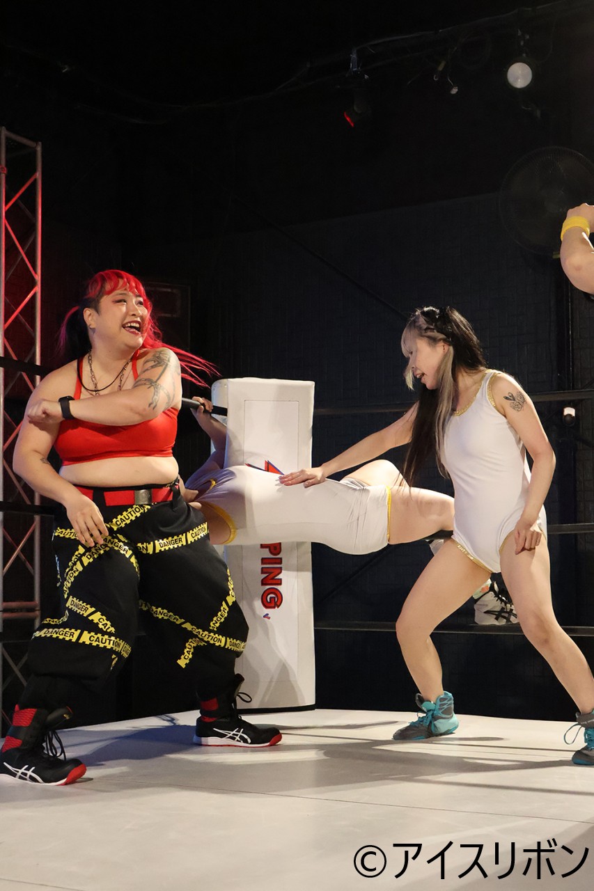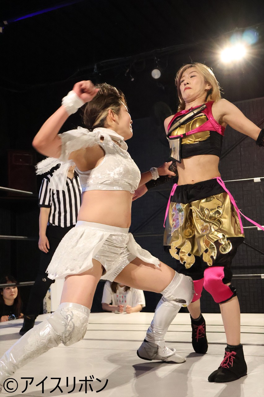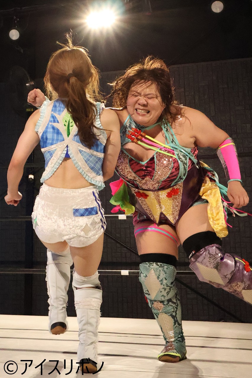 ませがコーナーに振っての串刺しエルボーからりこの腕を引き込んで中央に持って行きりこの腕にエルボー。さらにませがアームブリーカー。ロープに逃れたりこの腕をロープにからめての絞め上げから、再度、アームブリーカー、腕十字固めと、徹底した腕狙いに出る。ロープに逃れたりこをませがコーナーに叩きつけるも、りこがませを対角コーナーに振っての串刺しドロップキック。さらにコーナーに叩きつけての踏みつけ。りこがキャメルクラッチからの鼻フック。さらにはりつけドロップキックでカバーもカウント2。