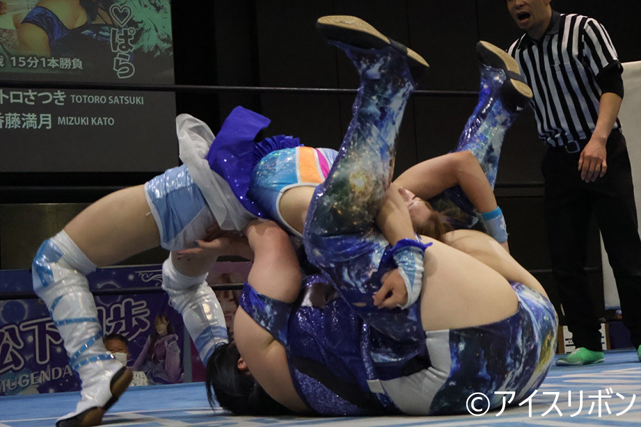 きらりがポンスタナー、ドロップキック。代わった優華がエルボー連打も飛び込みを抱え上げたトトロがコーナーに優華を逆さにぶら下げて串刺しボディアタック。トトロがファイヤーマンズキャリーも逃れた優華がエルボー1発でトトロを倒し、エンジェルサンダーもトトロがかわす。すかさず香藤がジャンピングボディプレス。起き上がった優華にトトロが飛び込みラリアットでカバーもカウント2。