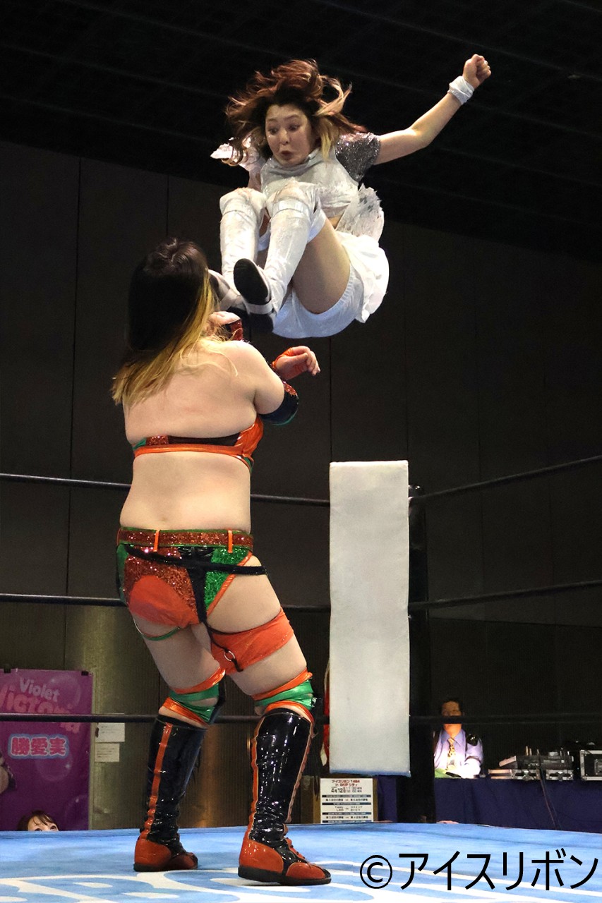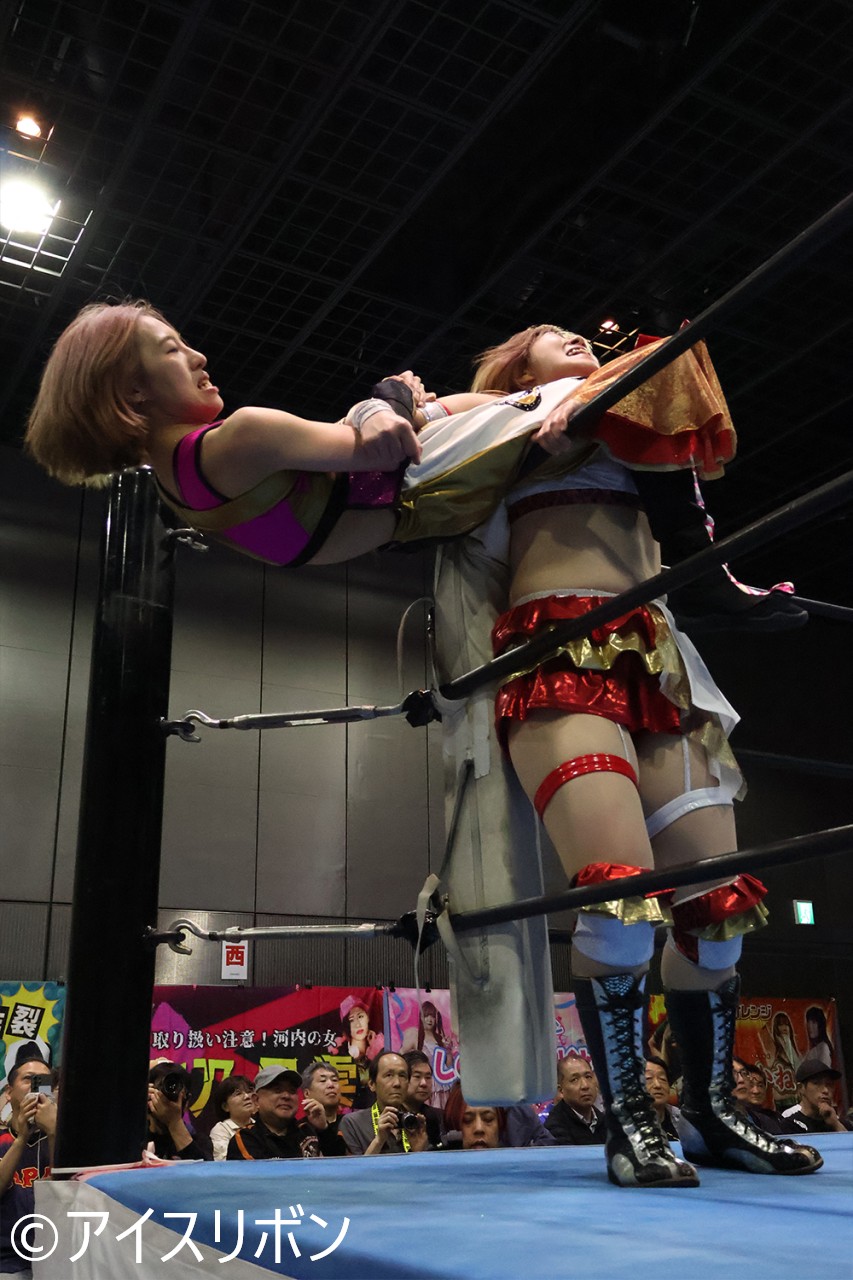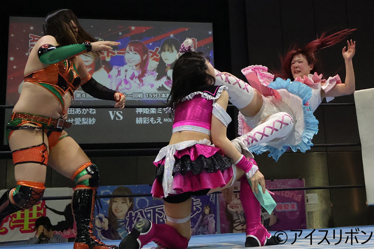 海乃がドラゴンスプラッシュもあかねがかわす。愛梨紗がチンクラッシャー、あかねがみかんでポン。愛梨紗がシャイニングウィザードを決め、あかねがカバーもカウント2。