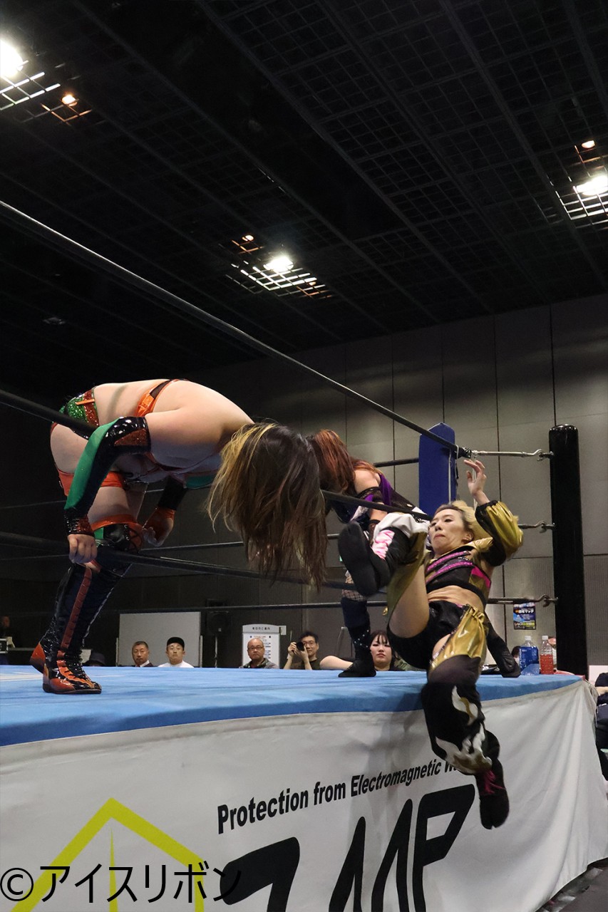 あかねがファイヤーマンズキャリーも綾子にバックに回ってのエビ固めを狙う。こらえたあかねがヒップドロップも綾子がかわし、正面ドロップキック。代わった海乃がコーナーからのクレイモア、場外助走付きジャンピングキックでカバーもカウント2。
