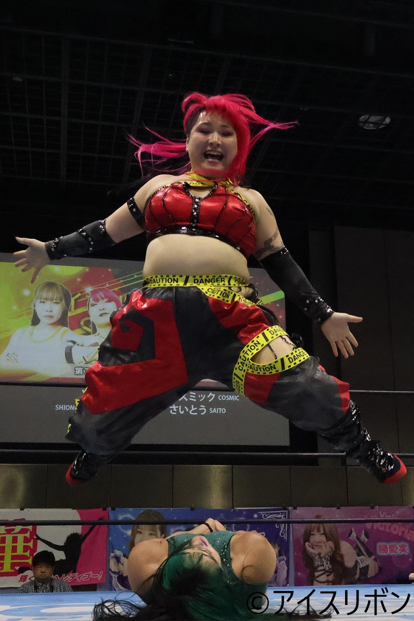 Yappy vsコスミックでスタートし、タックルの打ち合いへ。しおのが積極的にタッチを求めてリングインするとコスミックにタックル連打から正面ドロップキック。さらにさいとうのエルボーも耐え、Yappyのアシストを受けてボディスラムを狙うが、逆にさいとうのボディスラムを浴びてしまう。代わったコスミックの猛攻に耐えてエルボー連打からドロップキックで、ようやくコスミックを吹っ飛ばす。ボディスラムを狙うがまったく上げられず、ここでYappyと交代。Yappyが見本となるボディスラムを披露。さらに串刺しヒップアタックを決め、しおのも串刺しエルボーを決める。コスミックも来日2戦目でダイビングボディアタックやジャーマンなど、大技を披露して健闘。さいとうも変形卍固めを決めるなどYappyを攻め込むがさいとうの飛び込みをカツ丼に決めたYappyがアックスボンバーからのパワースラムでさいとうから3カウントを奪取。