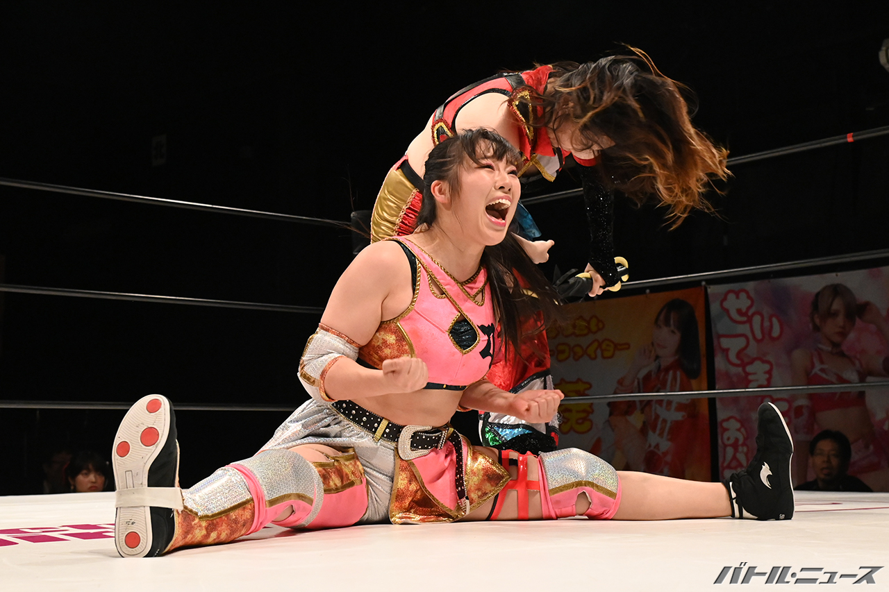 寧々が茉莉の背中にエルボー連打からロープに飛び、ハイキックを避けてアルゼンチン。これはさくらがカット。