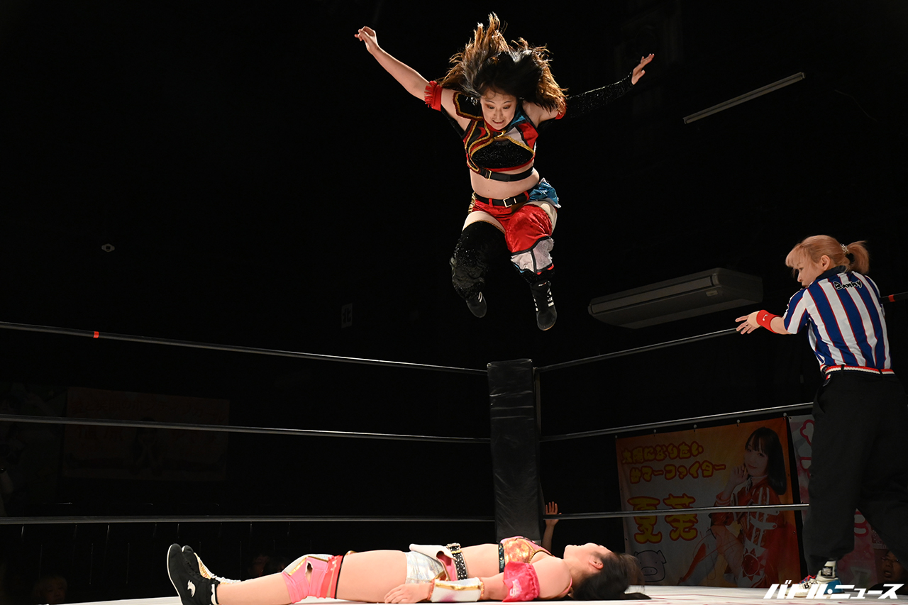 夏葵はコーナーに振ろうとするが、逆に茉莉乃が振って串刺しドロップキックから逆コーナーに振って走り込むと、夏葵がコーナーを駆け上がろうとするが足を滑らせる。