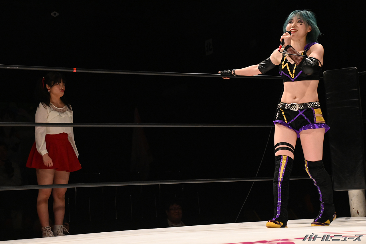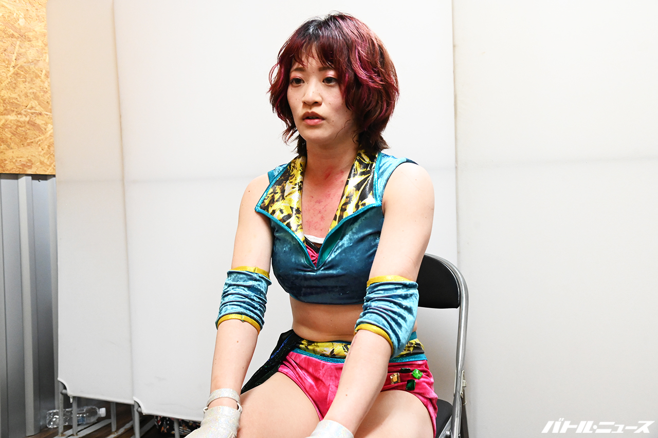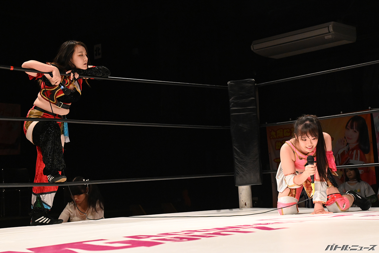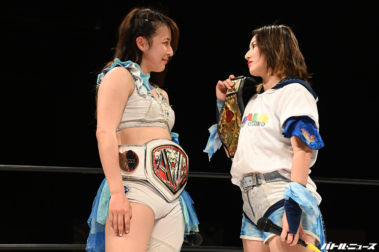「それについてはですね、非常に残念な気持ちではありますが、もちろんね、やっぱり後楽園ホールというね、大きい場所で、夏葵さんと一緒に、隣で闘いたかったって気持ちはもちろんあります。ただ、ここはね、夏葵さんもね、今日防衛するだろうって言ってくれてたから防衛しましたし、しっかり、後楽園ホールでAWGとって、夏葵さんに二冠になってやったぞと、安心してこの私がこの団体引っ張っていくぞというのを見せたいなと思うので、隣に立てないのは淋しいですがもちろん、しっかり勝ってやろうと思います」