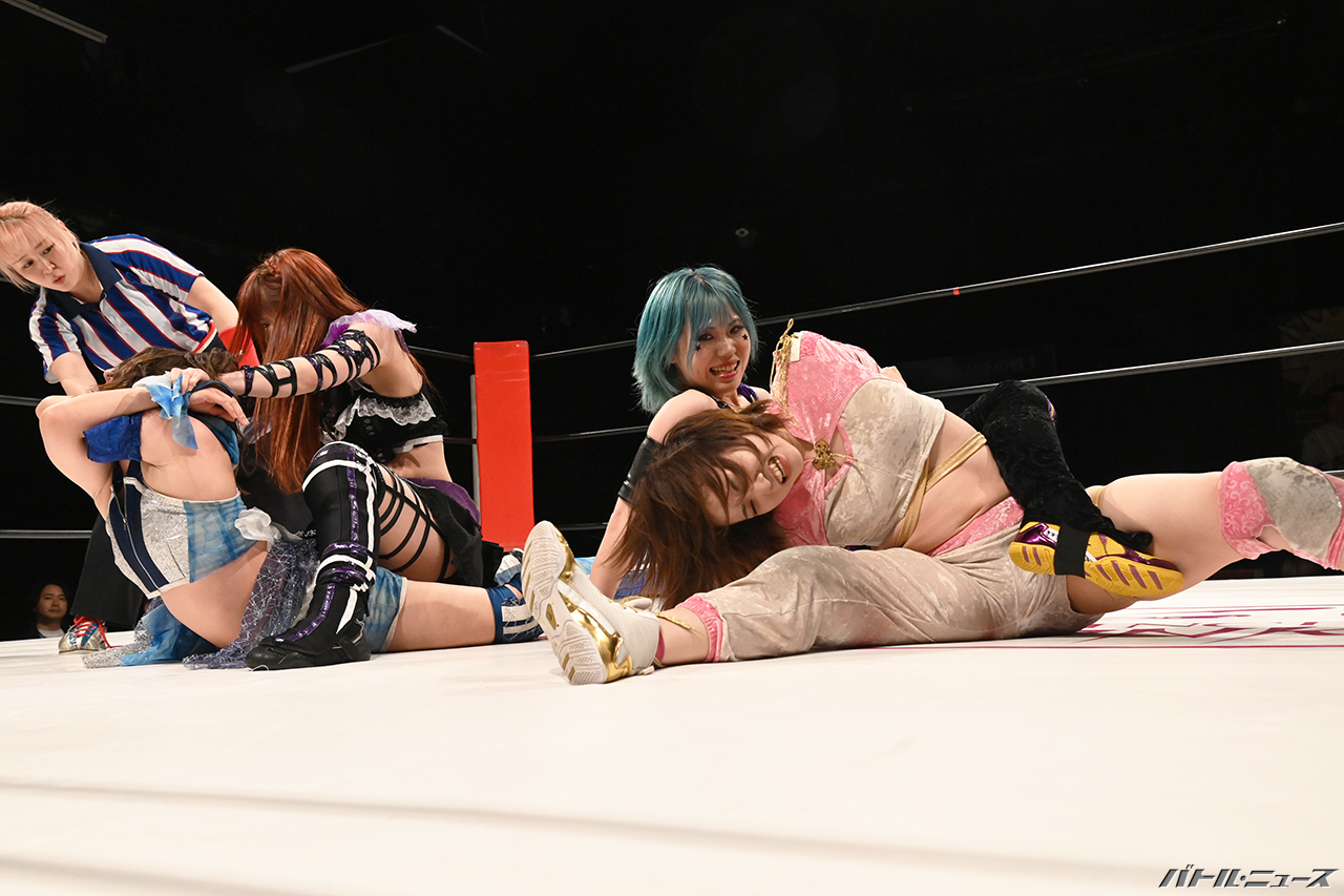 さくらはまとめて鎌固めで捕らえ、これを離すと寧々にストンピングから茉莉に逆打ちを狙うが、寧々がまとめてラリアットでなぎ倒すもさくらがそのまま丸め込むが寧々があわててカット。