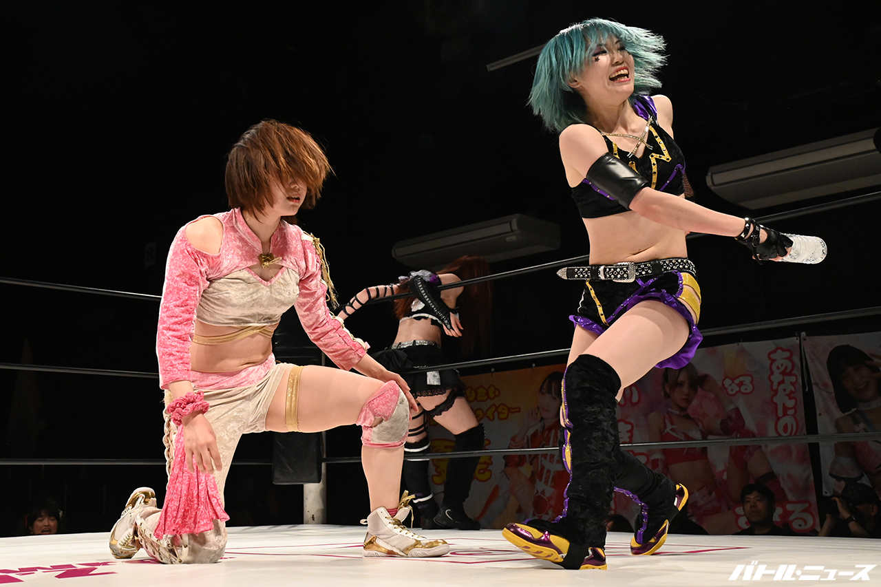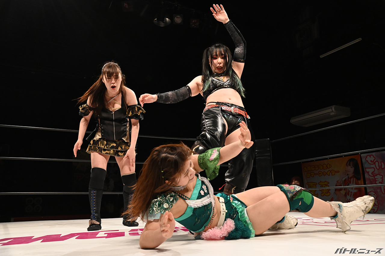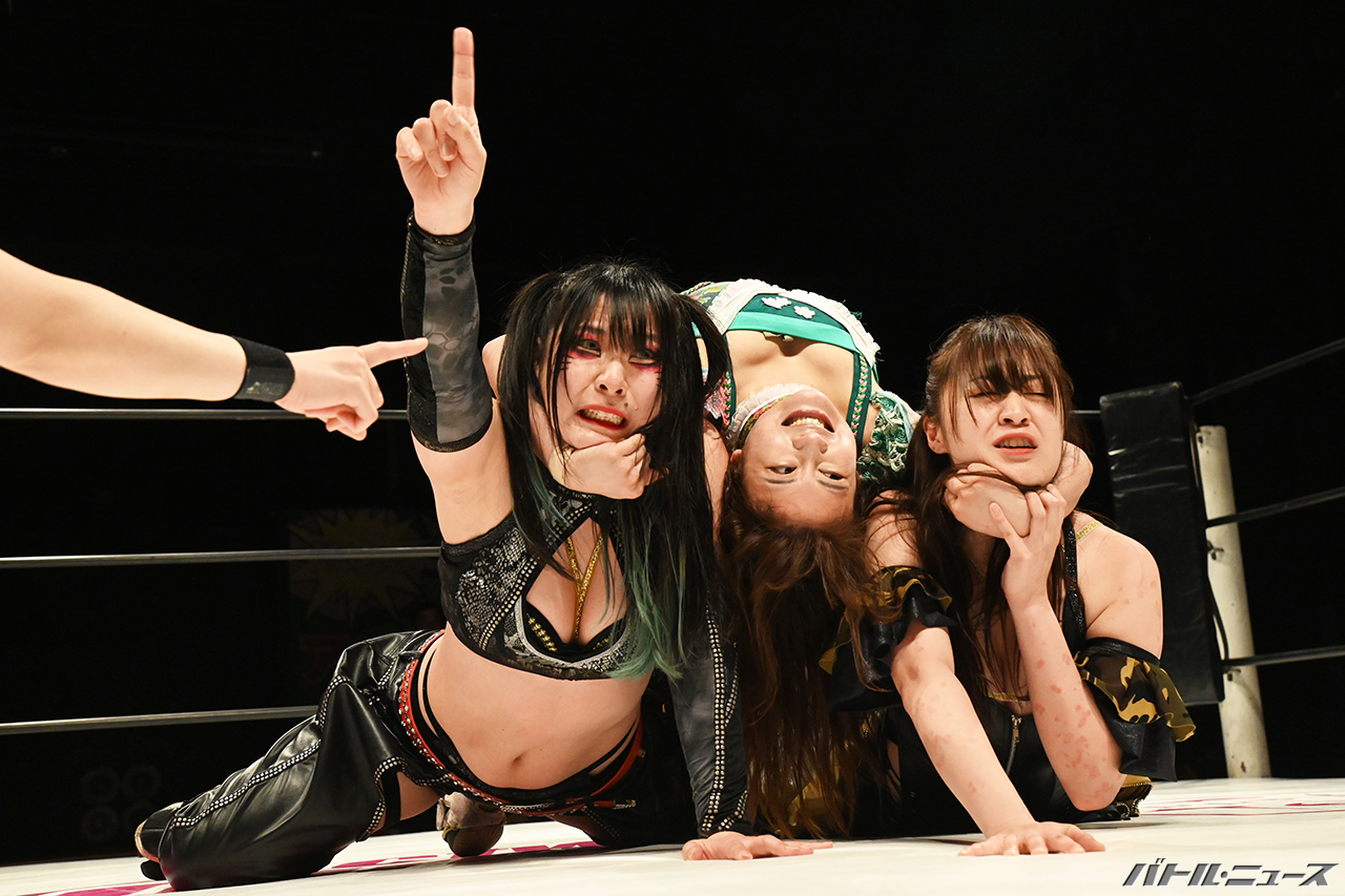 茉莉が寧々の足を刈っていき、ロープに飛んでスライディングレッグラリアート。さらにロープをまたいだチョーク攻撃。カウント4で離した茉莉が場外のさくらを蹴りつけ、リングに戻ると寧々ともみ合いに。そこへさくらがクロスボディも、茉莉と寧々はキャッチしてリングに叩きつけると場外に蹴り落とす。