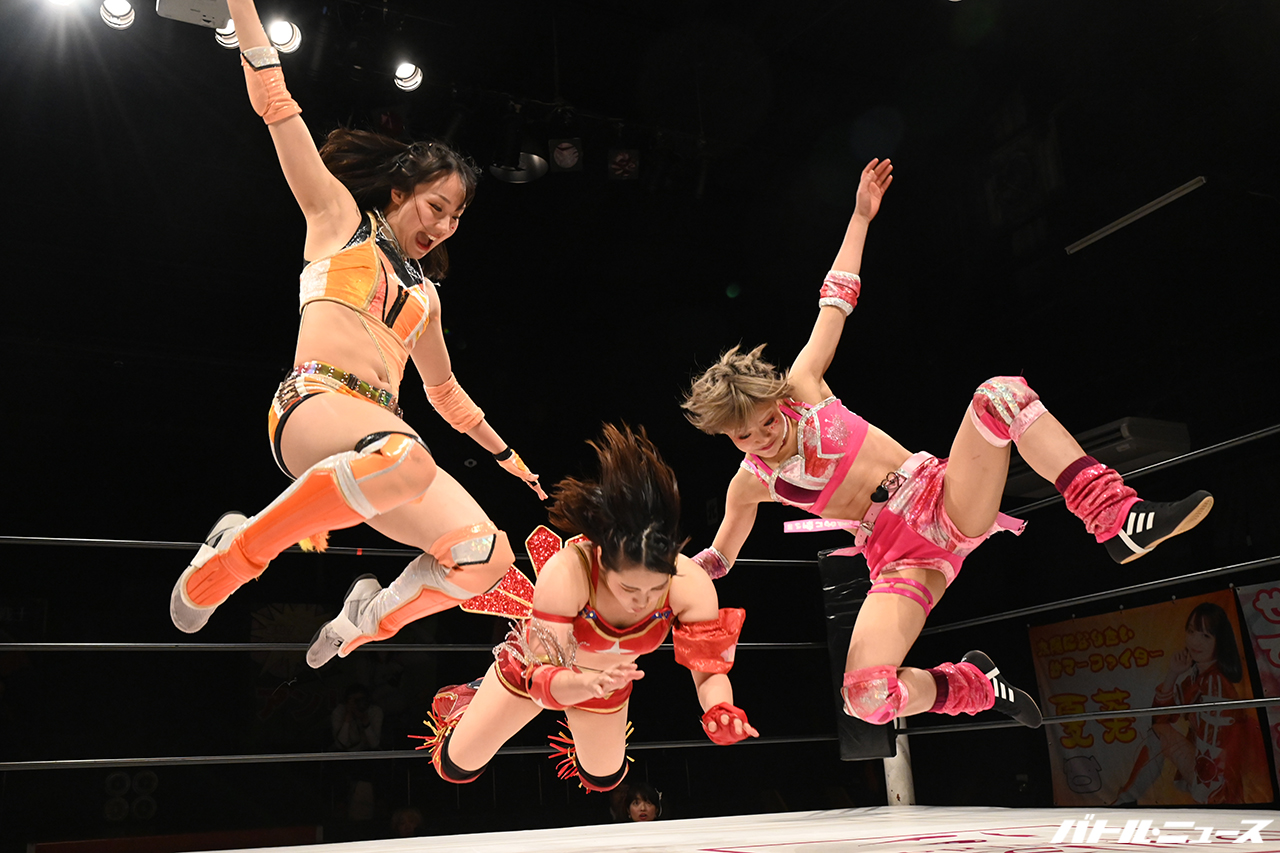 寧々がさくらにエルボーからロープに振ろうとするが、さくらが切り返すも寧々がロープを掴み耐える。茉莉がさくらの背中にエルボーからサイドバスターで叩きつけ、走り込んできた寧々のラリアットを巻き込んで熨斗紙でさくらに向けて叩きつけるが、さくらは避ける。