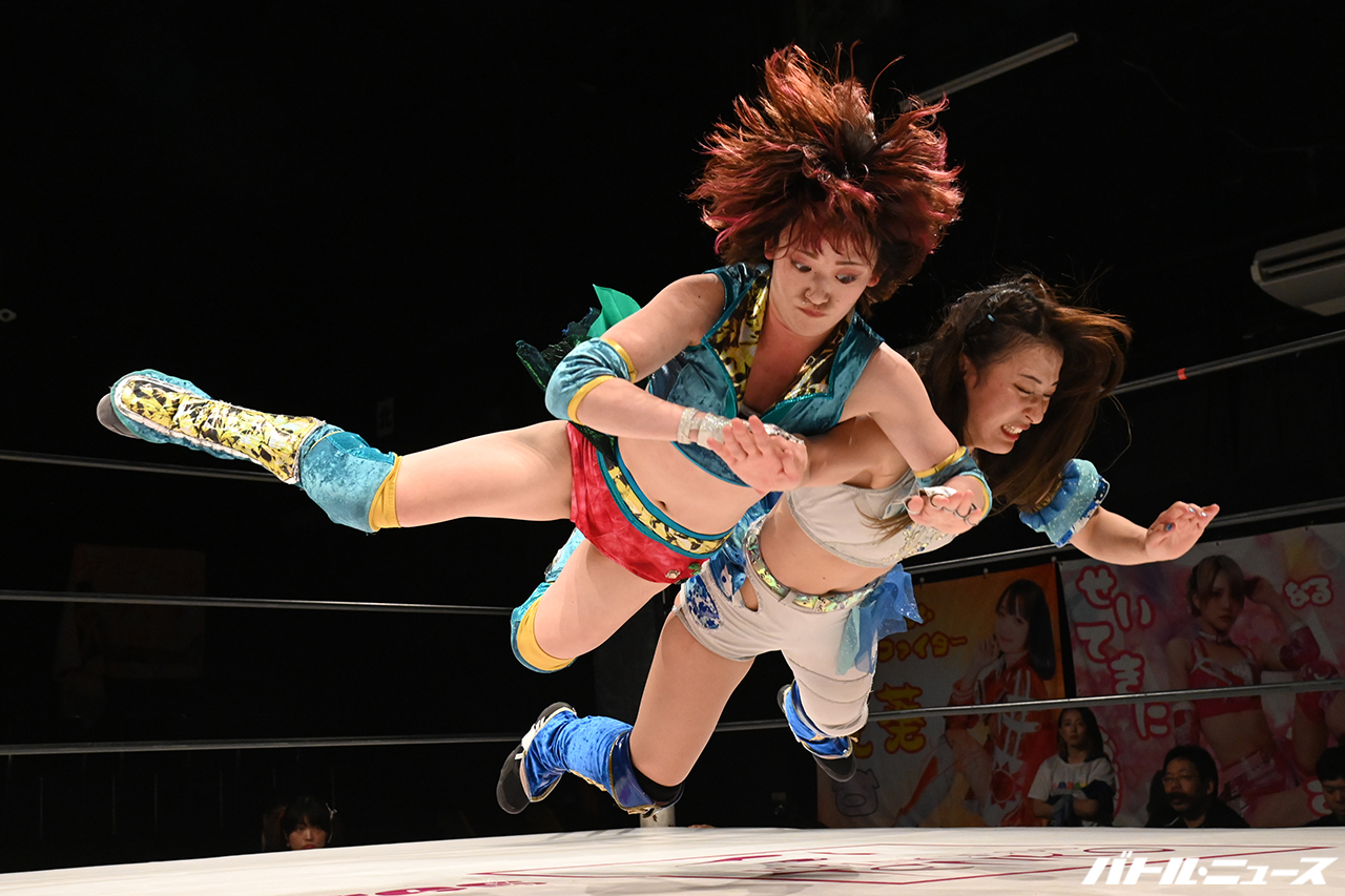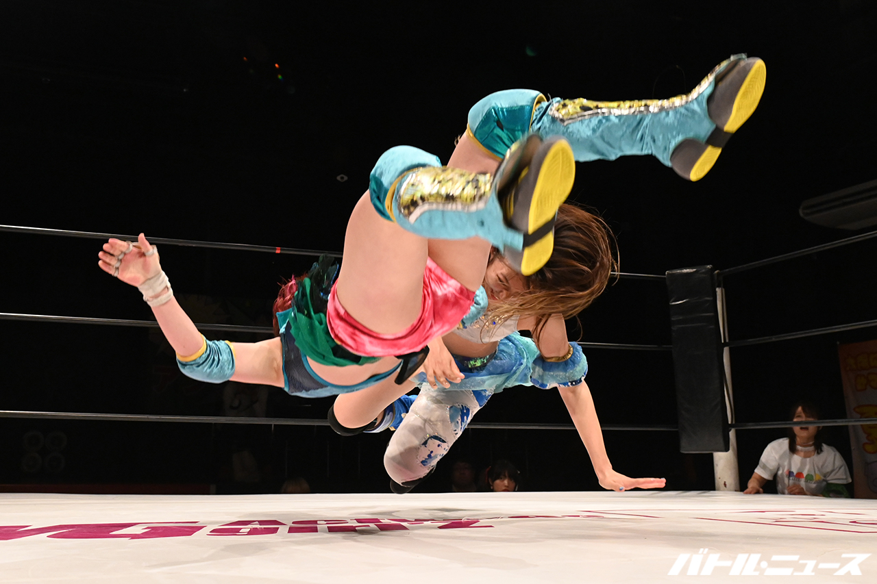 先発は茉莉乃と夏葵。バックの取り合いから夏葵がハイキックも、避けた茉莉乃がロープに飛んでドロップキック。避けた夏葵がジャンピングニーも、避けた茉莉乃にハイキック。これも避けた茉莉乃がロープに振るが、夏葵がブーメランアームホイップからドロップキック。すぐに茉莉乃が立ち上がり、両者タッチ。