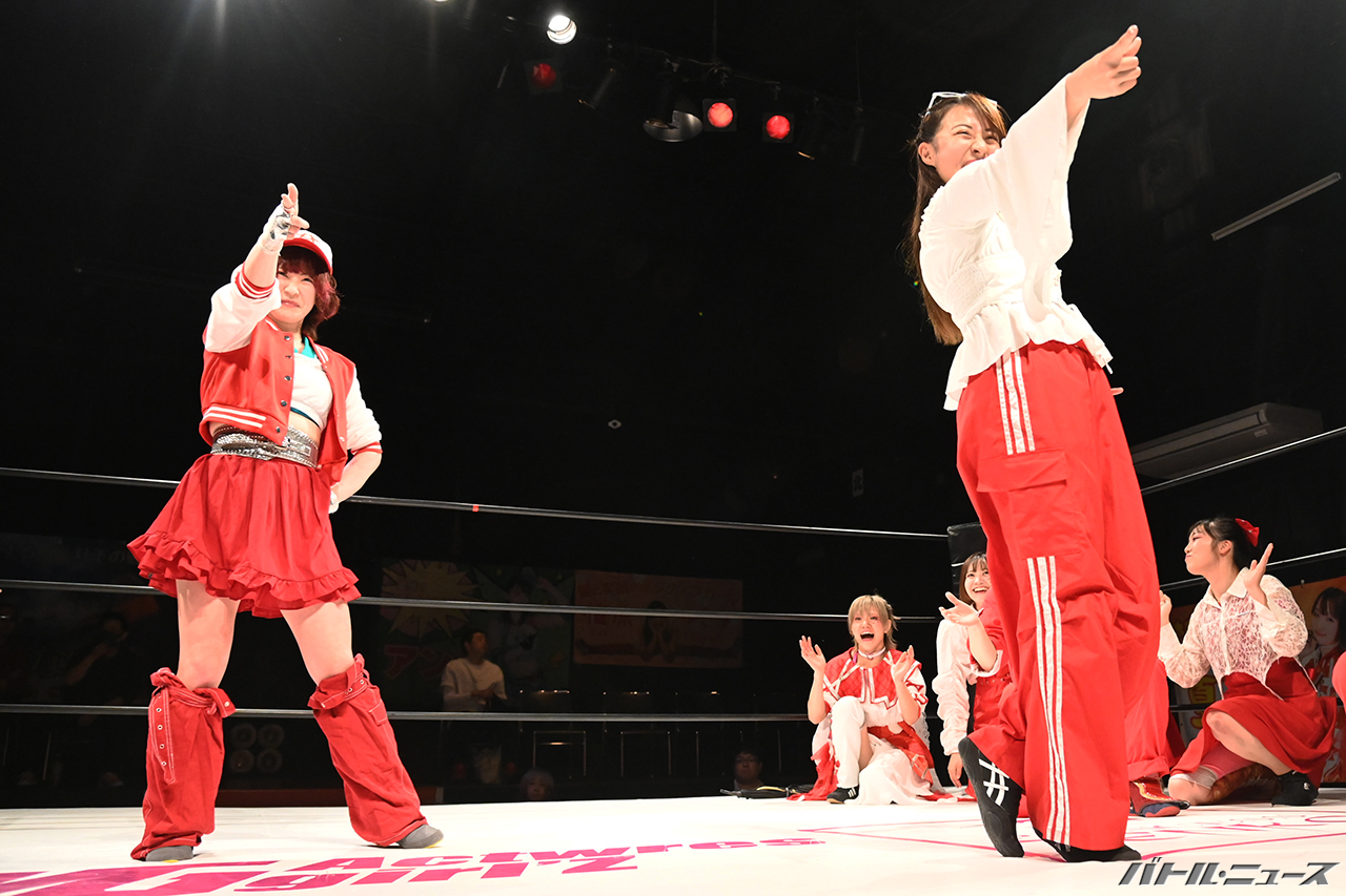 さくらは寧々の背中にエルボー連打からコーナーに振っていくと、串刺しドロップキックを突き刺しロープに飛んでクロスボディ。茉莉と寧々はキャッチしてリングに投げ捨て、場外に蹴落としていく。