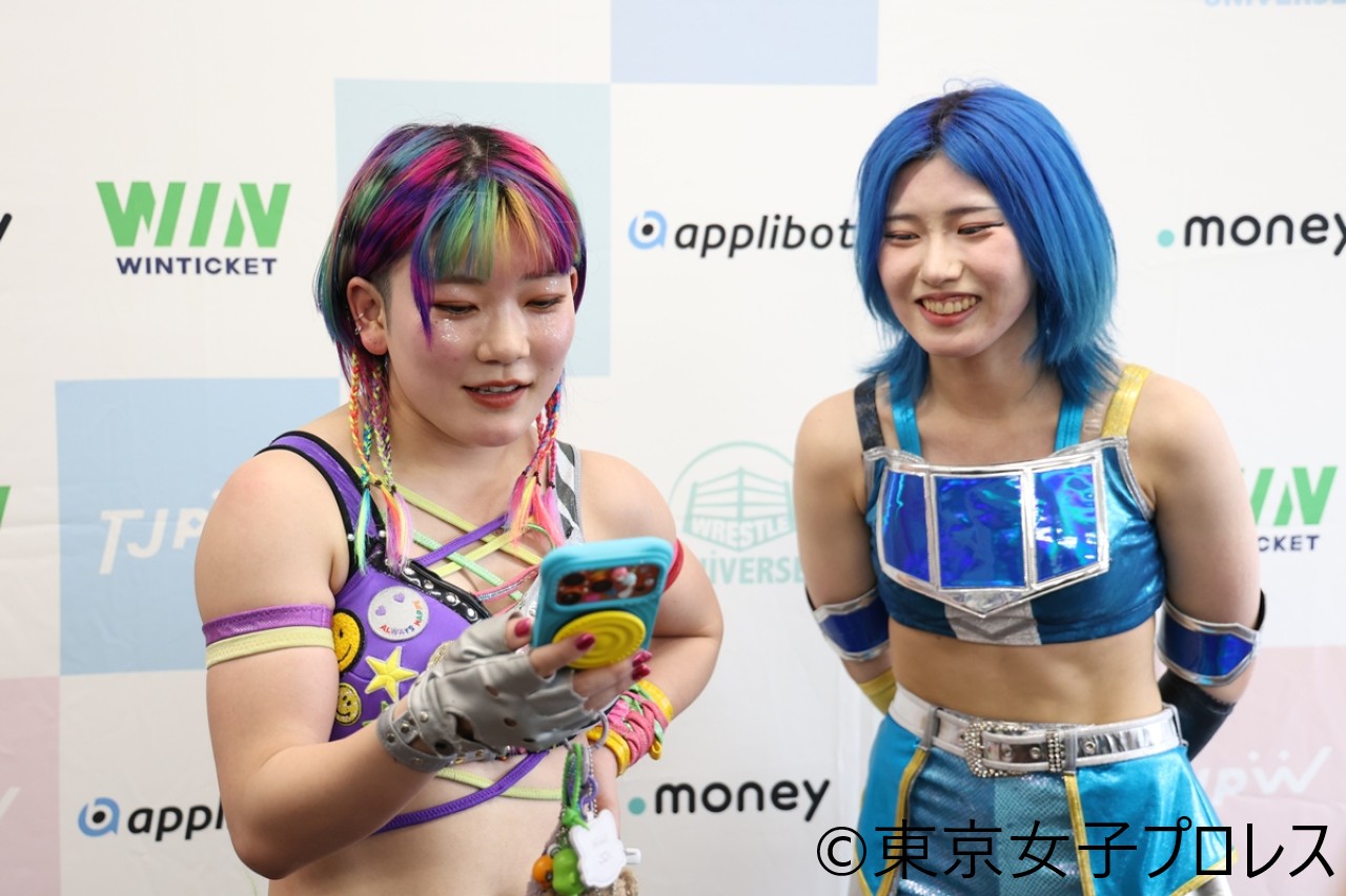 バックステージで遠藤は「私は荒井優希に負けてばかりで、去年(8・17大阪)のトーナメント(東京プリンセスカップ準決勝)で勝ったものの、正直悔しくて。勝っても悔しいって、もっと勝たないとダメなんだなって。荒井は私の一歩先を行ってる感じだから、ベルト獲って、もっともっと荒井に勝てるように。もっと強くなりたいと思います」とコメント。すると控え室に戻って、自身のスマートフォンを持ってくると、まだラスベガスに滞在中の荒井にLINE通話で直電。配信を見ていたという荒井はこれを受諾し、遠藤の挑戦が決定的になった。