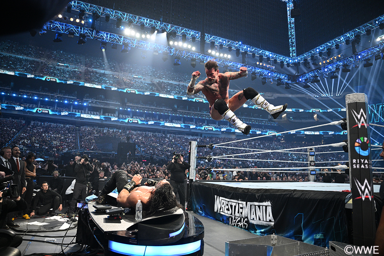 パンクは追い討ちのエルボードロップを連発すると、先ほどは逃げられた実況席に寝かせてのエルボードロップをセットアップしていく。コーナーポスト上でためらいのような表情も浮かべながらパンクはこれを成功させる。