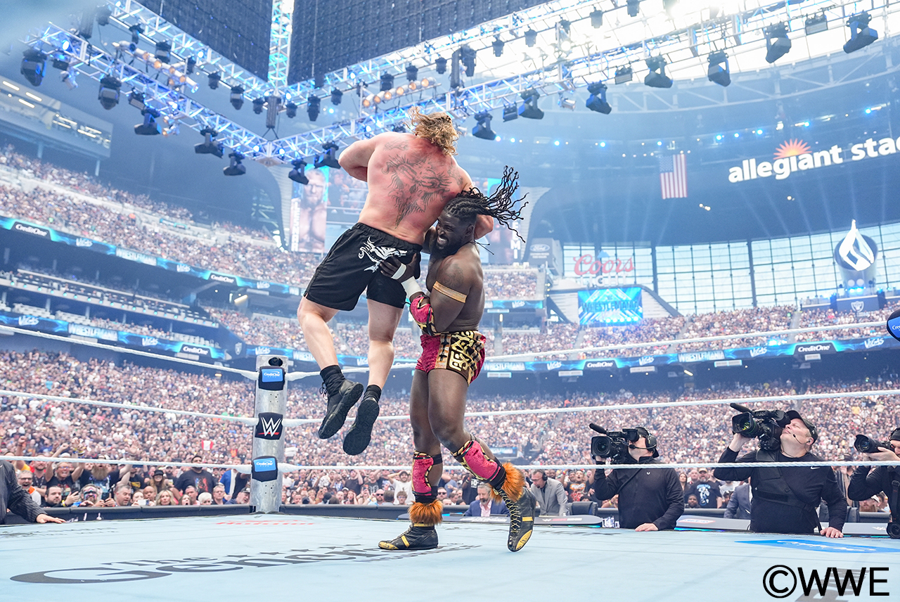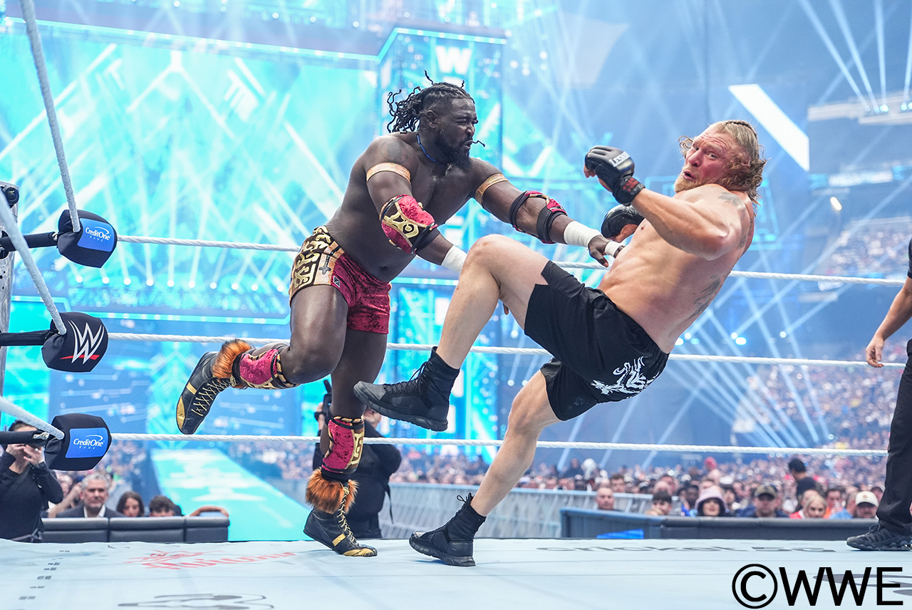 力強いロックアップから始まった試合は、そのせめぎ合いだけでも大観衆にどよめきを起こさせる。そして両足タックルで抱え上げたレスナーがコーナーに押し込んでオバのボディにタックルの連打を食らわすも、オバは雄叫びをあげてから突き飛ばし、レスナーの表情を一変させる。続けてのレスナーのクローズラインは2発ともあえて受け止め、3発目は相討ちながらもレスナーだけが倒れ込む。