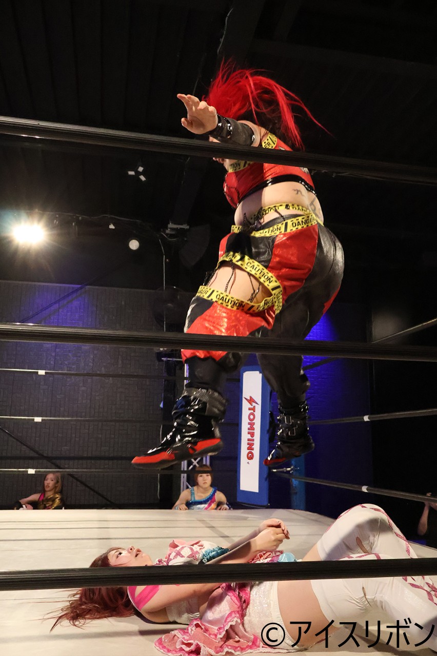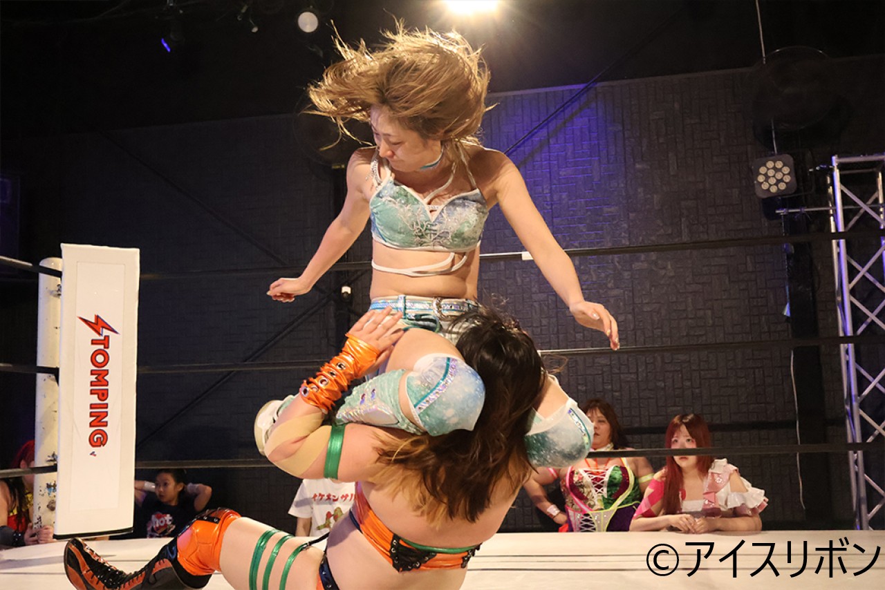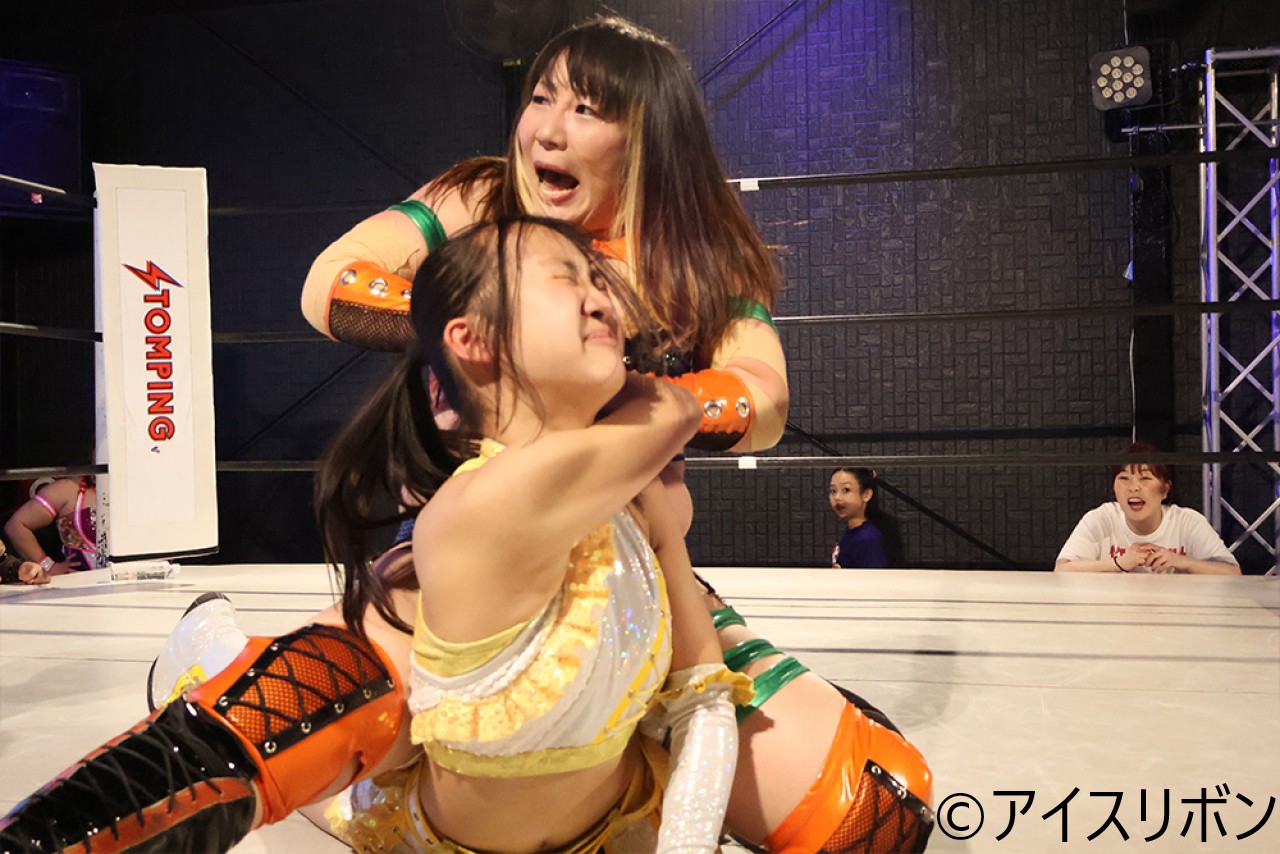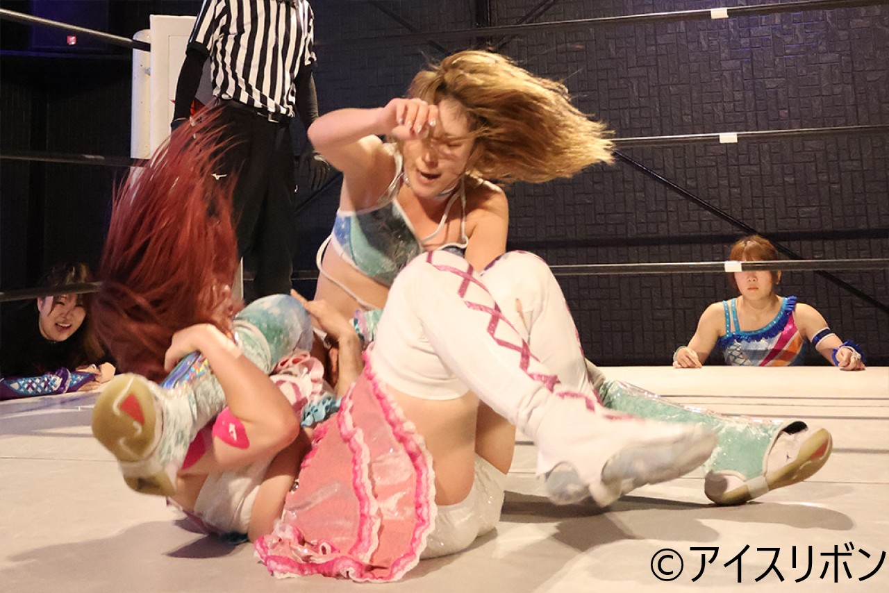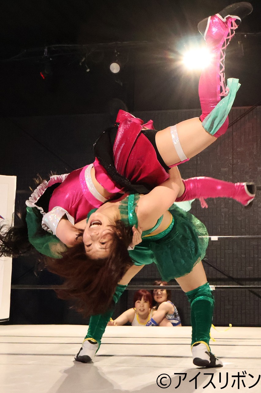 りこがエルボーからのフィッシャーマンズ・スープレックスでホールドもカウント2。りこが旋回式ボディプレスを決めるも時間切れ。