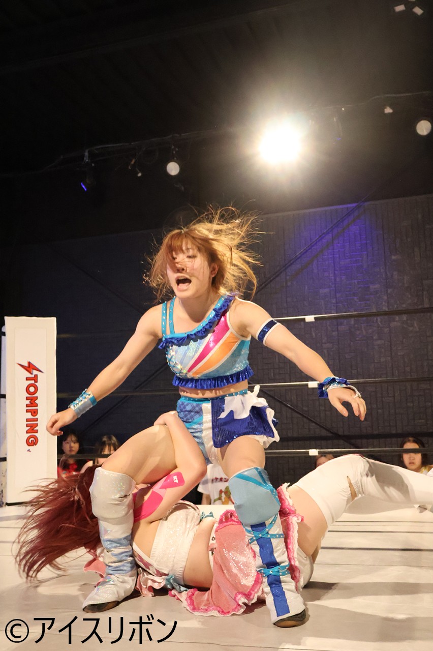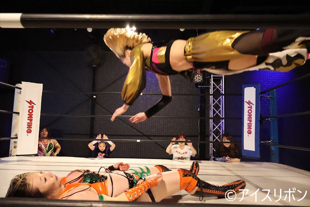 vsきらり 大の字の海乃にきらりがダイビングフットスタンプを決めカウント3奪取。